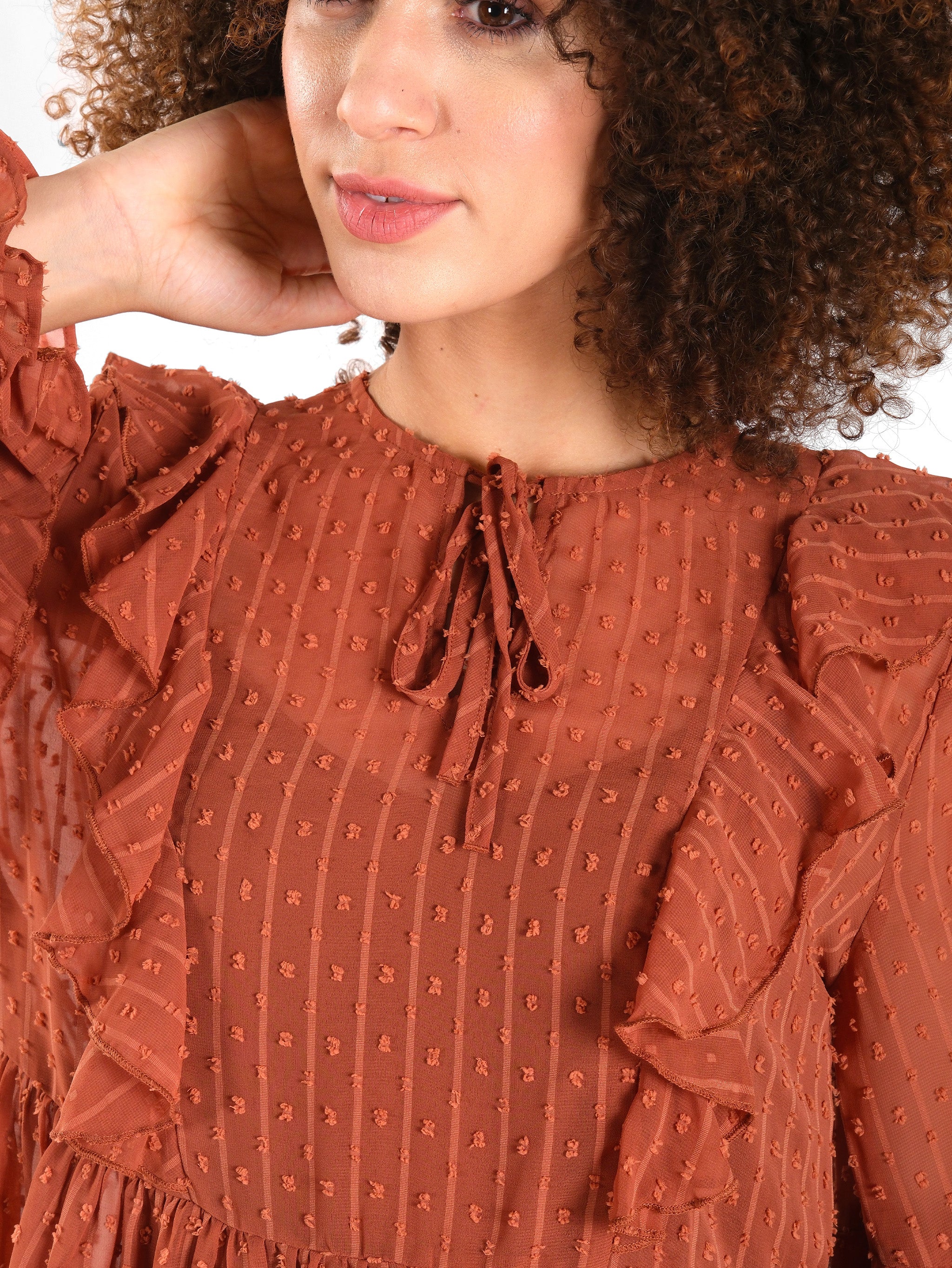 Hecho de gasa dobby liviana con forro interior, textura vertical delicada y brillo sutil, detalles de volantes a lo largo del frente y las mangas para un toque romántico, escote con lazo y frunces suaves en el canesú, mangas acampanadas en capas con puños elásticos, cintura elástica para mayor comodidad y forma, completamente forrado para mayor cobertura y comodidad.