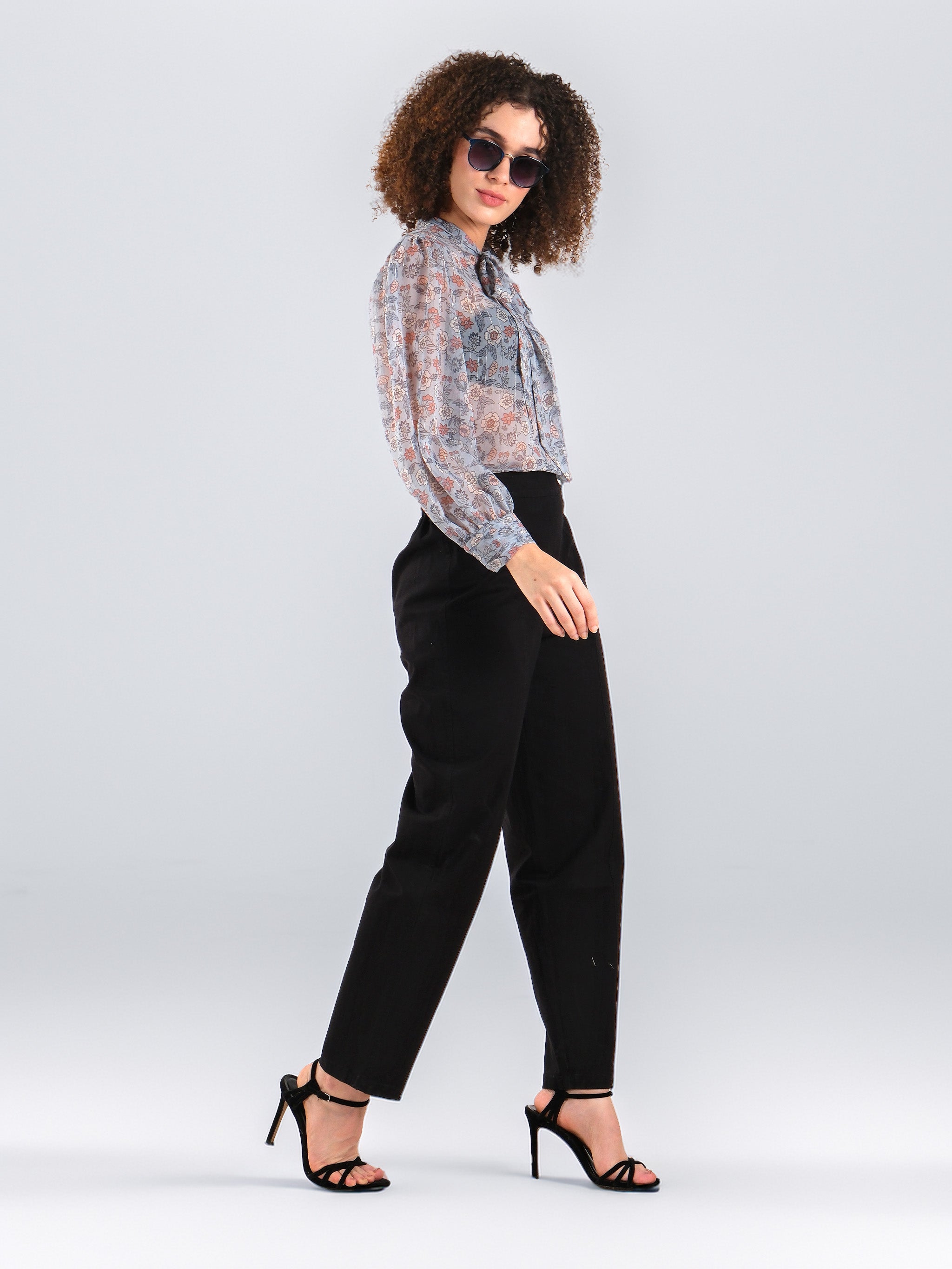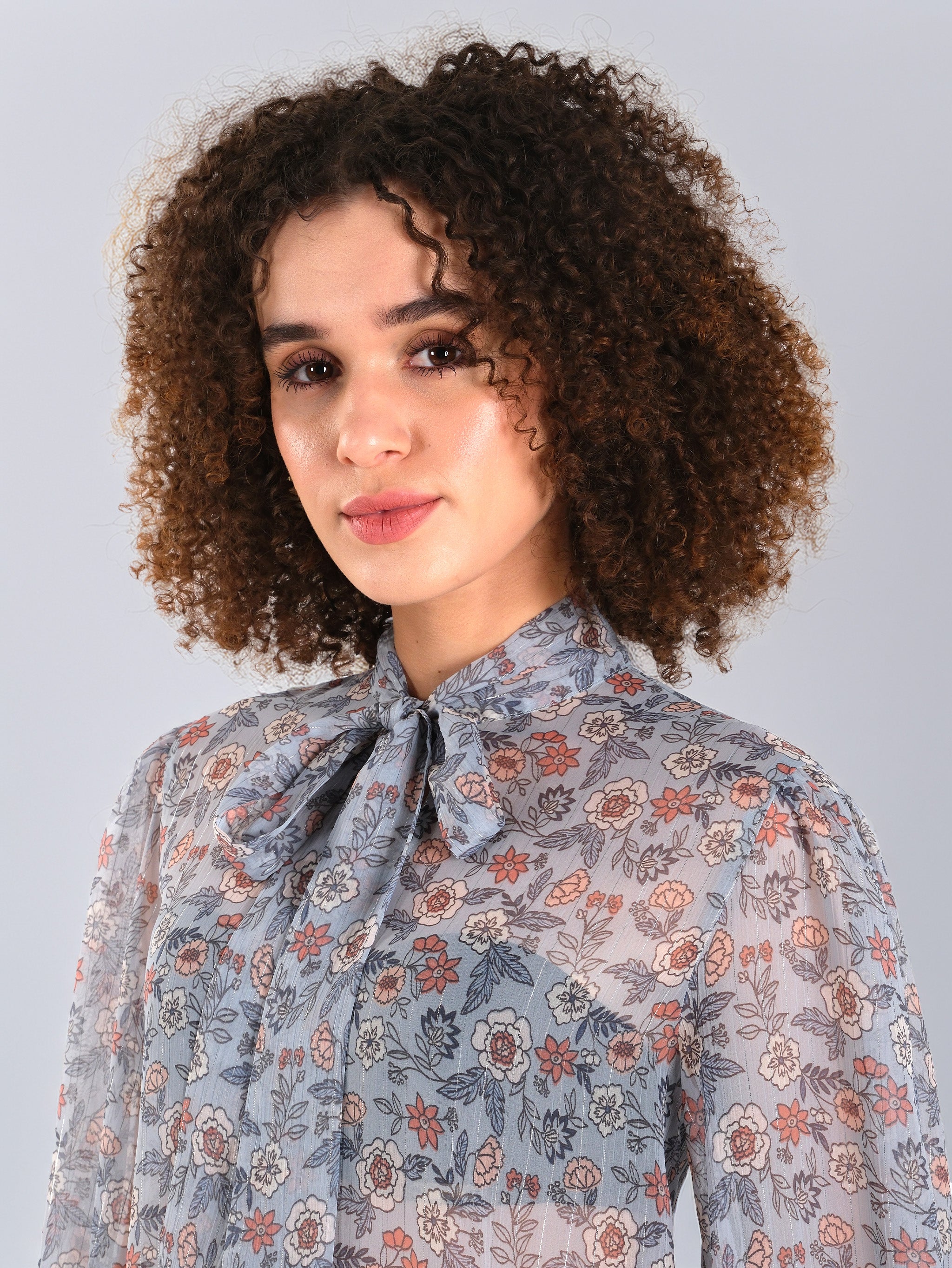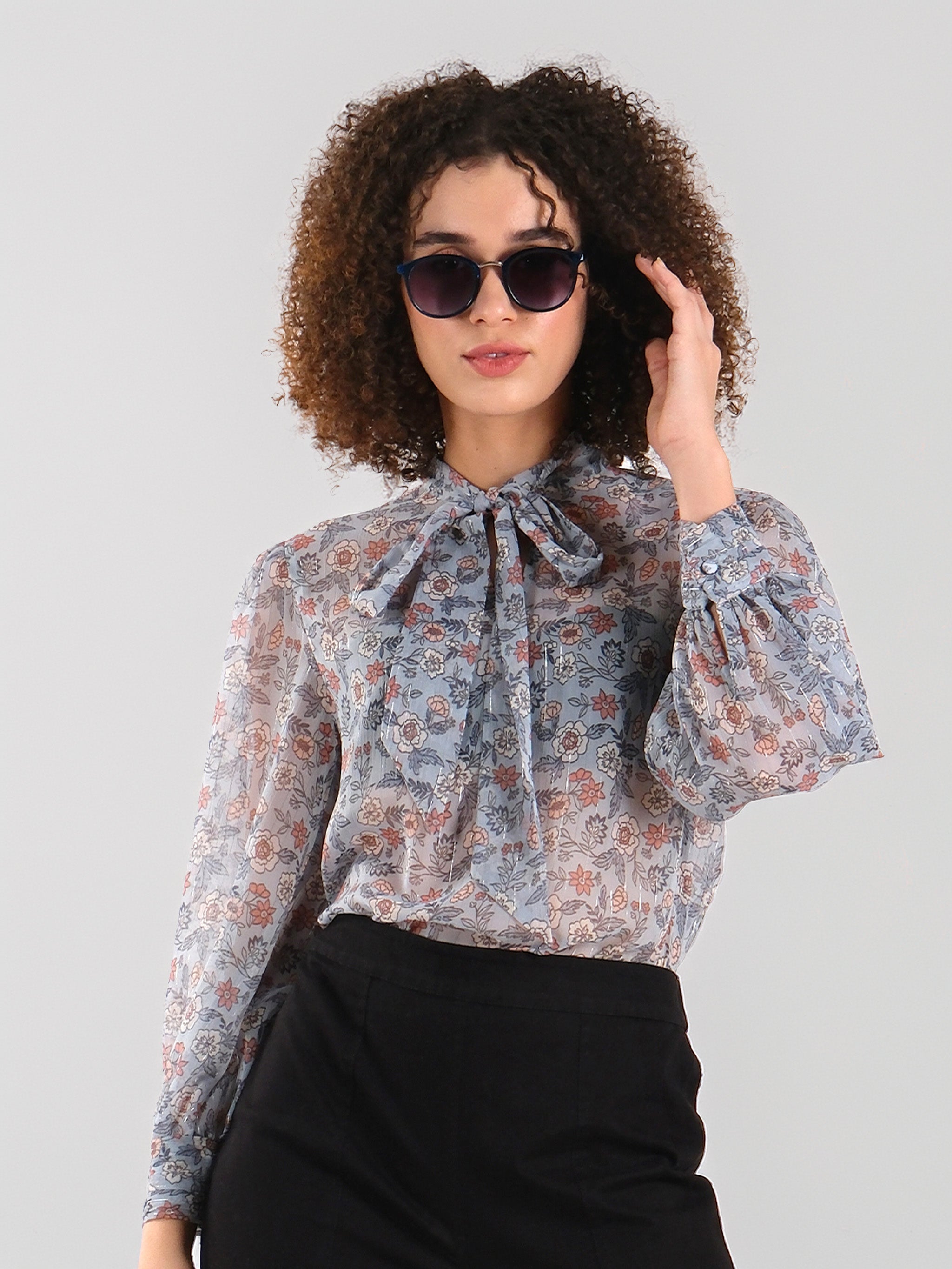 Blusa floral transparente con lazo en el cuello