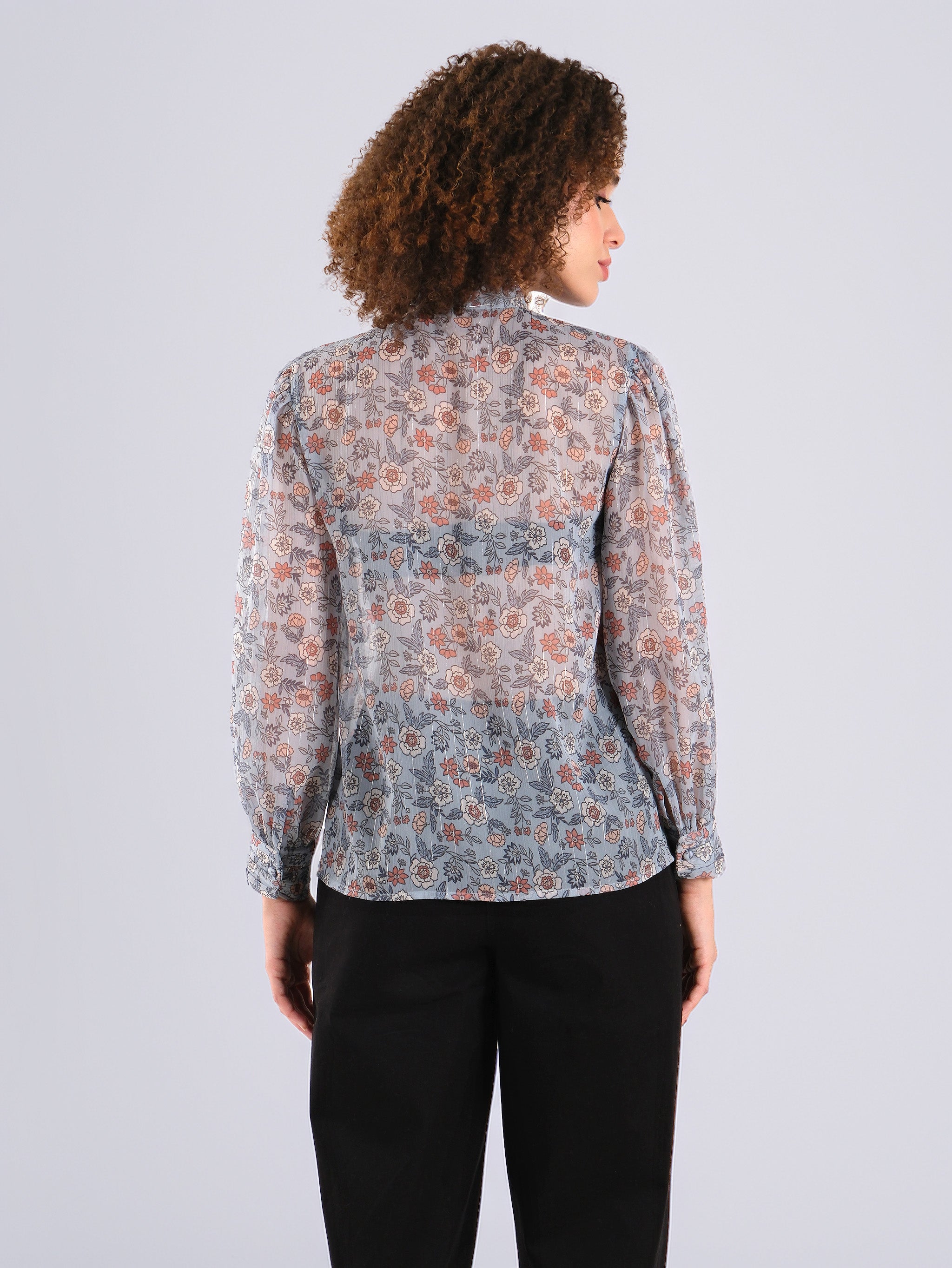 Hecho de gasa transparente liviana con estampado floral por todas partes, elegante lazo en el escote para una apariencia refinada, mangas completas con puños fruncidos para un volumen sutil, ajuste relajado para una caída y comodidad sin esfuerzo, ideal tanto para el trabajo como para salidas de fin de semana.