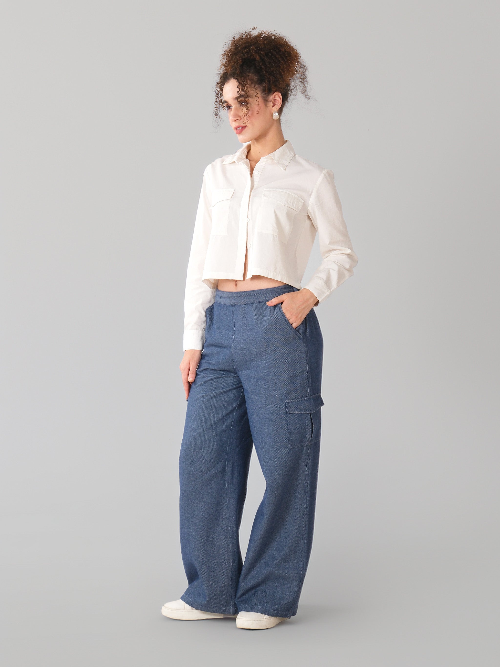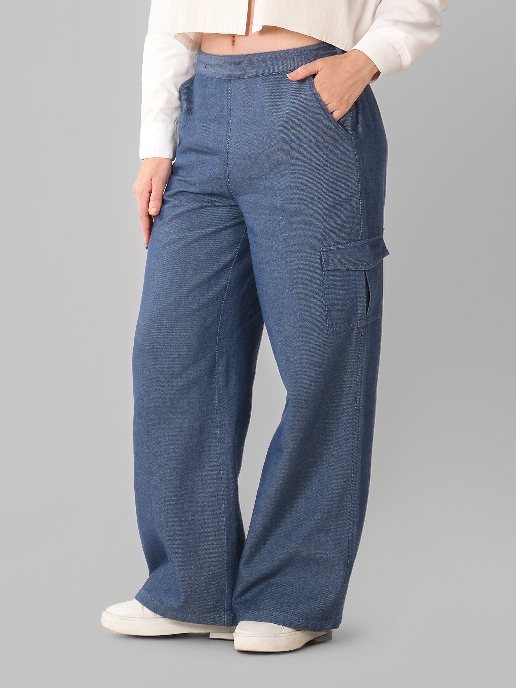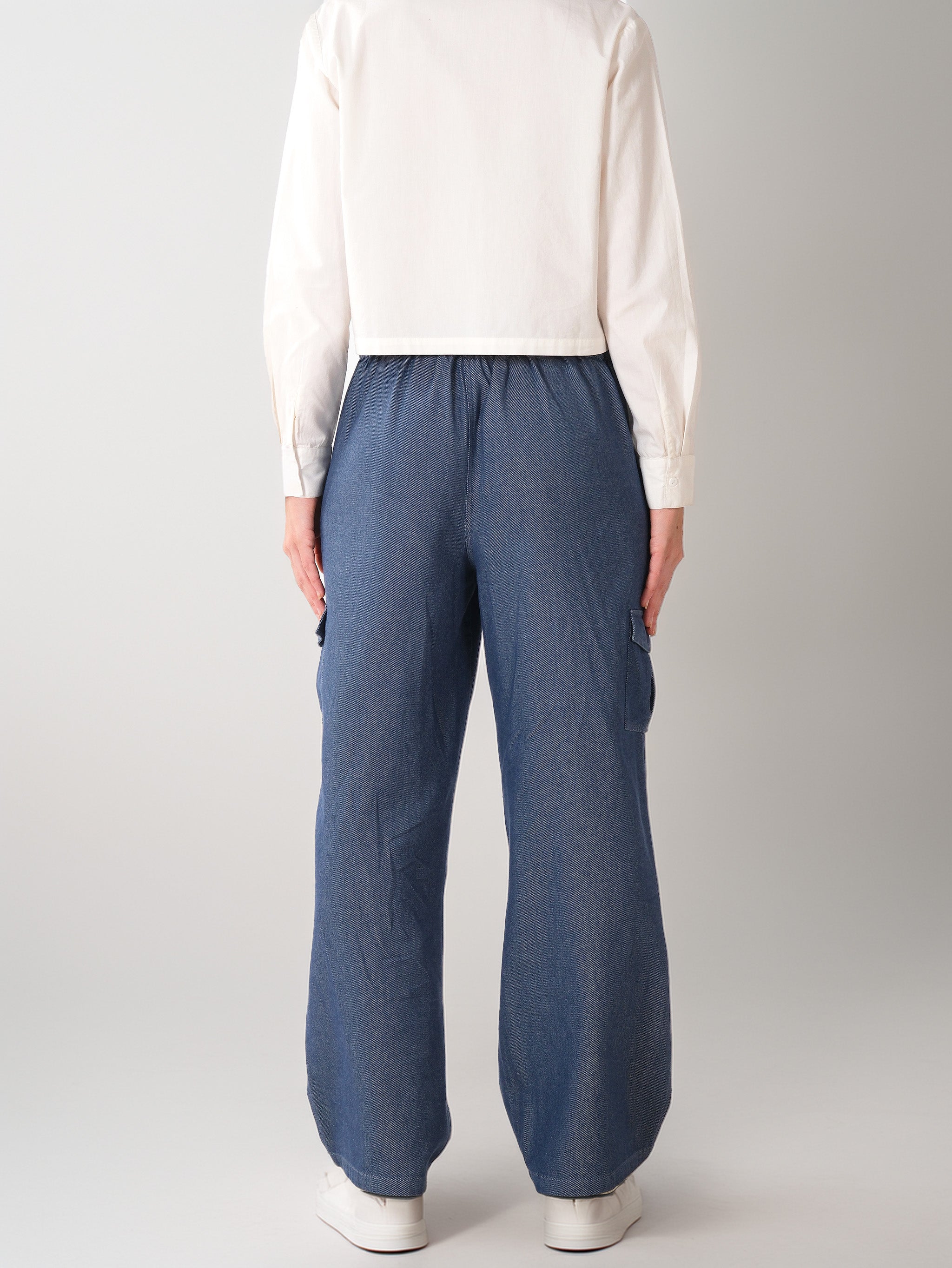 Hecho de mezclilla suave y liviana para comodidad durante todo el día, cintura elástica para un ajuste ceñido y flexible, bolsillos laterales funcionales y un solo bolsillo de carga para un atractivo utilitario, acabado informal, perfecto para viajar, hacer recados o descansar el fin de semana.