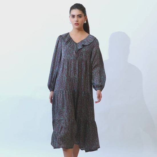 Vestido largo con cuello con volantes y estampado paisley
