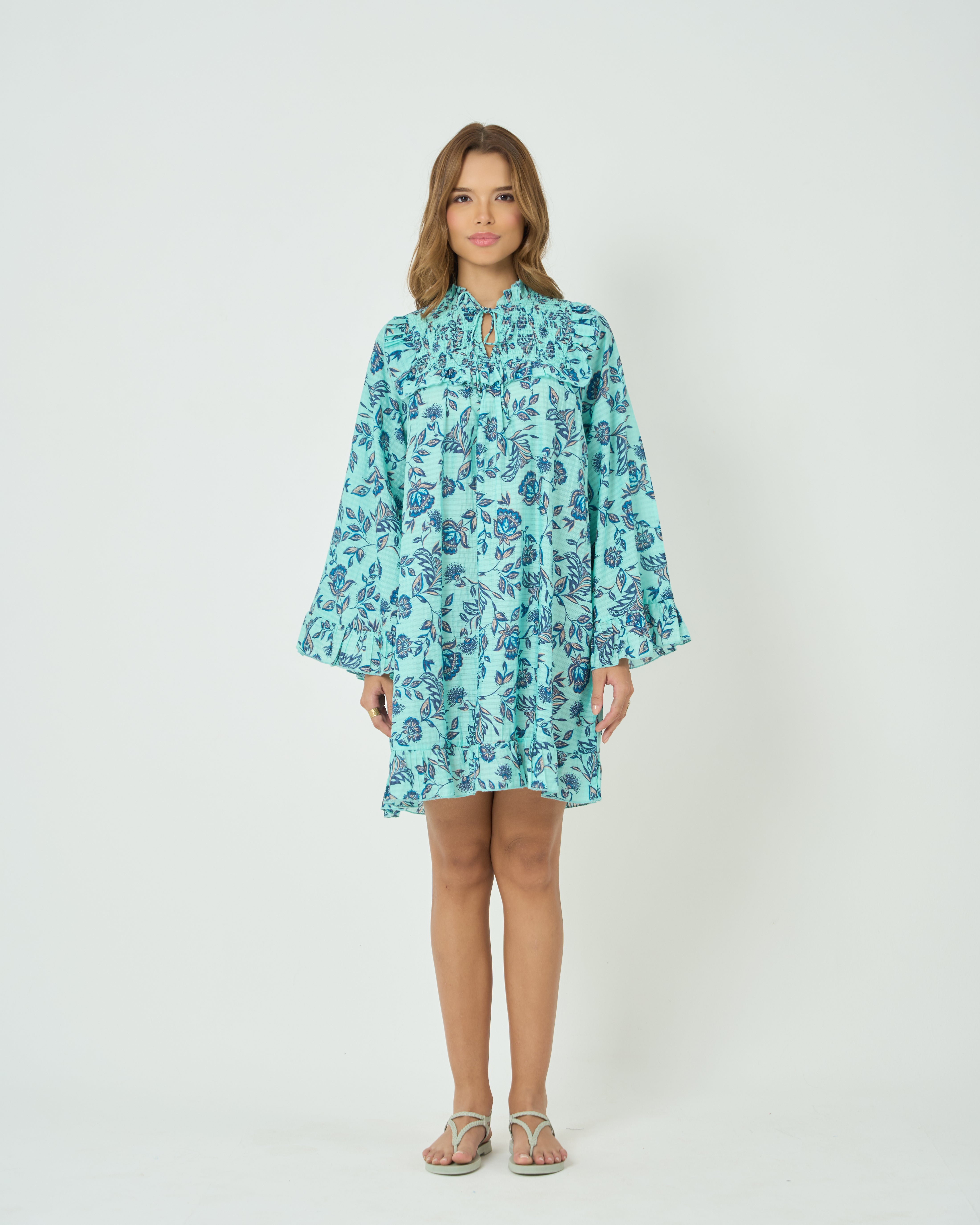 Tela de algodón liviana con estampado botánico azul, escote alto con volantes y lazo en forma de cerradura, mangas largas acampanadas con fruncidos suaves, corte relajado con un suave volante en el dobladillo, largo por encima de la rodilla para una sensación fresca, sin forro para una caída natural y aireada.
