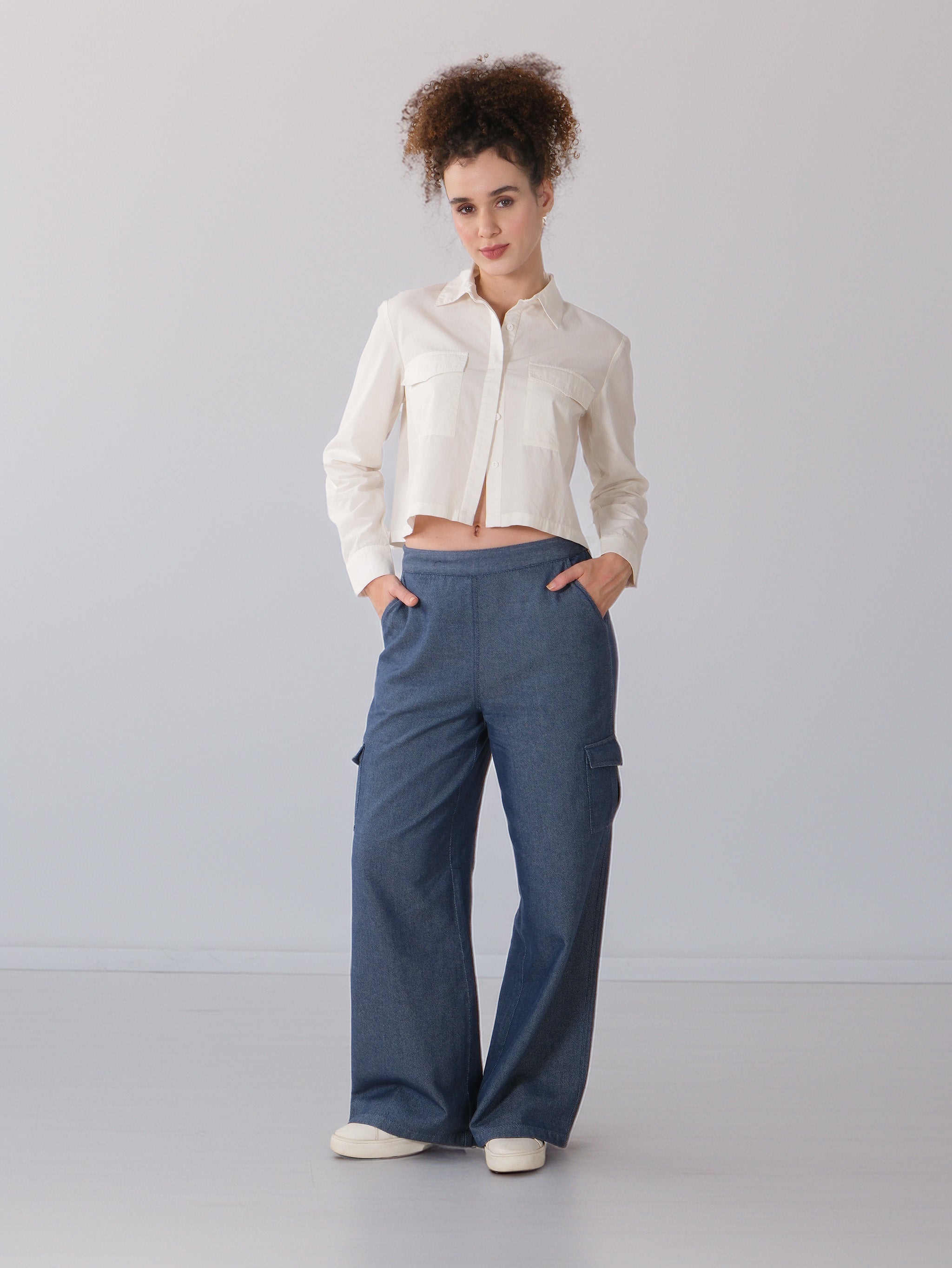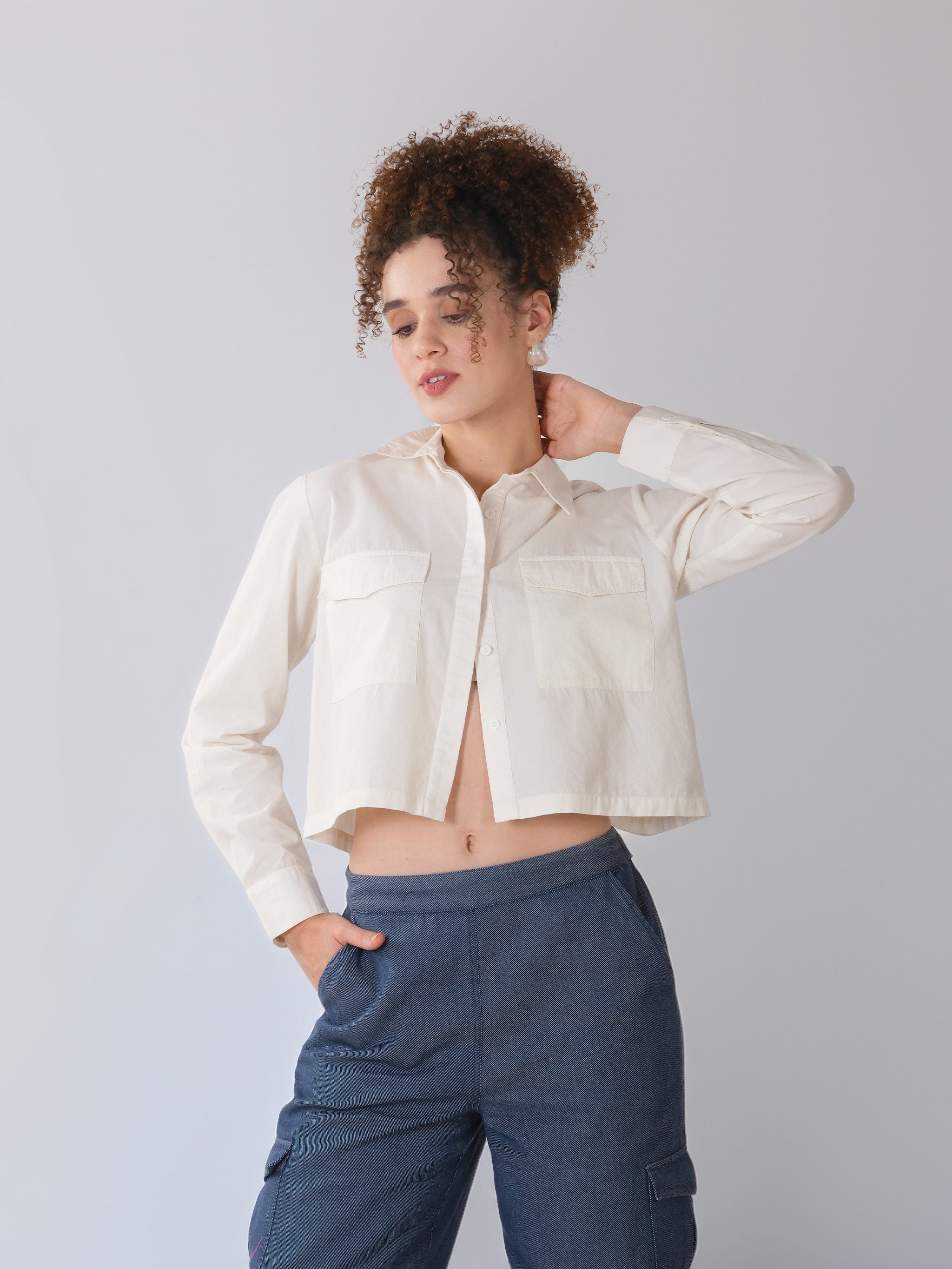 Fabricado con tela de algodón de primera calidad para transpirabilidad y estructura, cuenta con dos bolsillos con solapa en el pecho para un toque utilitario, escote clásico con tapeta de botones en el frente, mangas largas con puños abotonados, largo recortado para una apariencia favorecedora y contemporánea.
