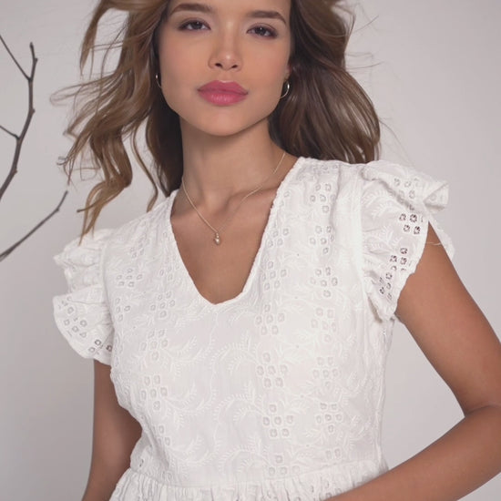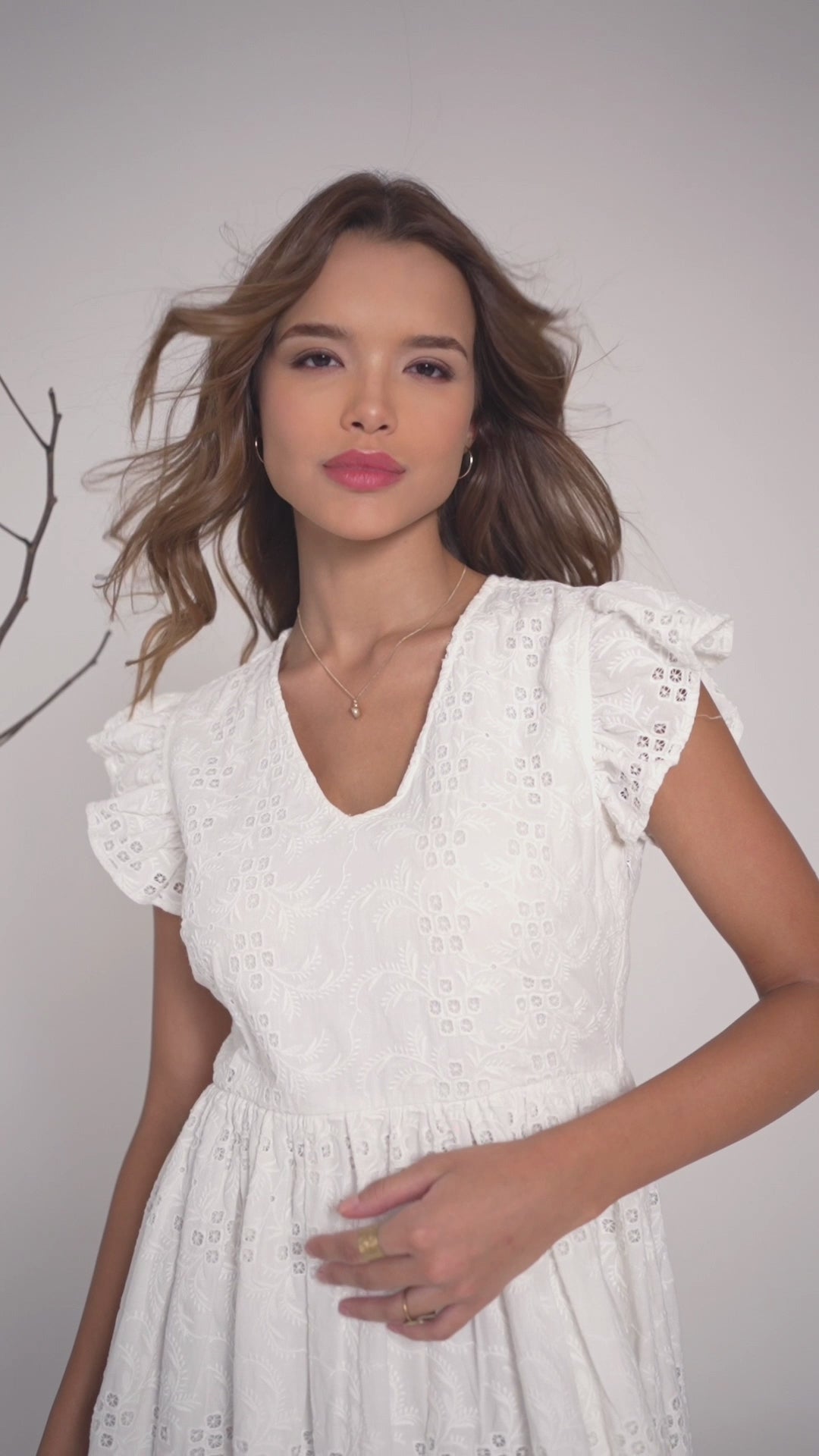Tejido 100% algodón con bordado Schiffli por todas partes, escote en V favorecedor con acabado de borde festoneado, mangas cortas con vuelo para un toque femenino, cintura elástica para mayor comodidad y ajuste, totalmente forrado para opacidad y facilidad, largo midi con un dobladillo acampanado suave.