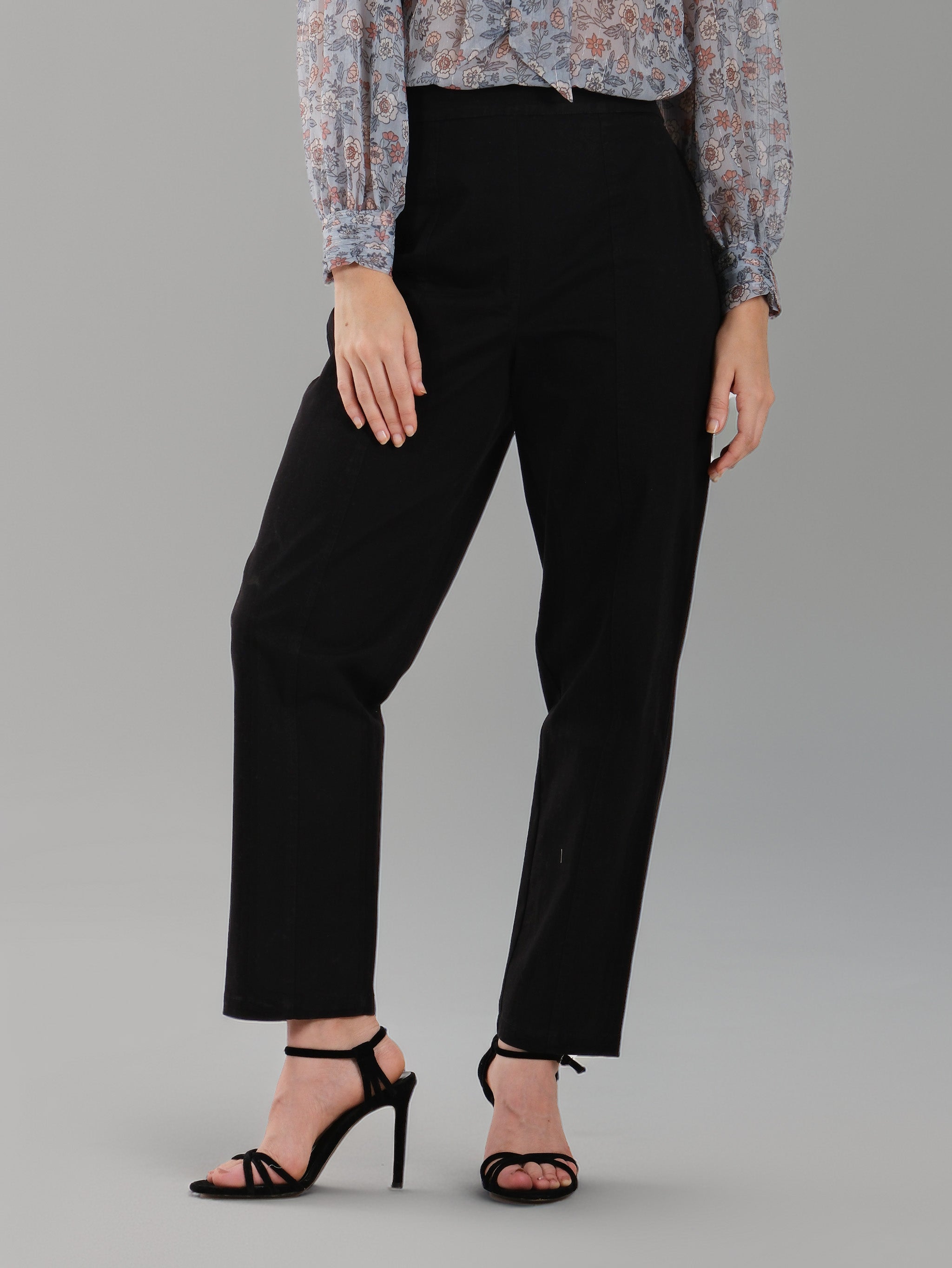 Coupe ajustée avec taille haute pour une silhouette élégante, coupe droite pour un look intemporel et flatteur, confectionné dans un tissu tissé doux et extensible pour plus de confort, finitions soignées sur le devant avec fermeture dissimulée, poches latérales fonctionnelles pour plus de praticité, détails minimalistes pour un style raffiné et polyvalent.