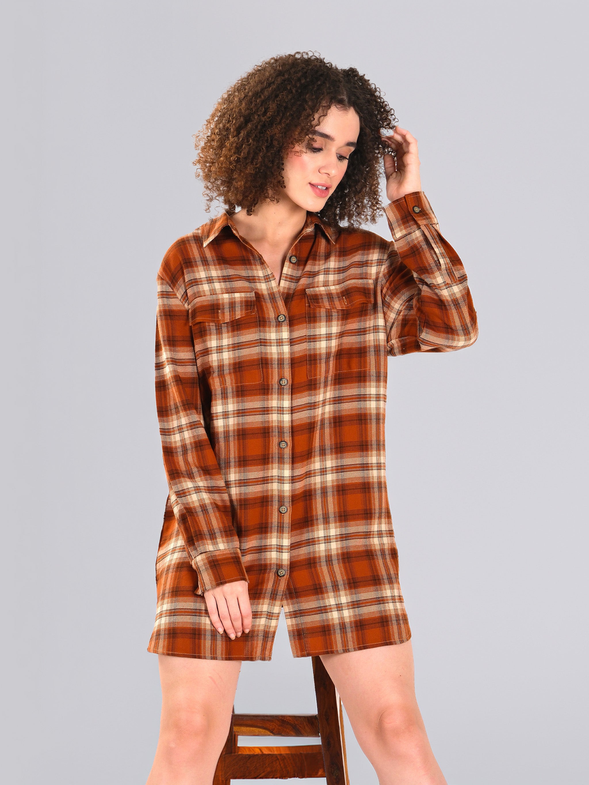 Tissu en flanelle douce à carreaux riches couleur rouille et beige, col classique avec fermeture boutonnée sur le devant, manches longues avec poignets boutonnés pour un style ajustable, deux poches à rabat sur la poitrine pour une touche utilitaire, coupe décontractée avec une silhouette mi-cuisse.