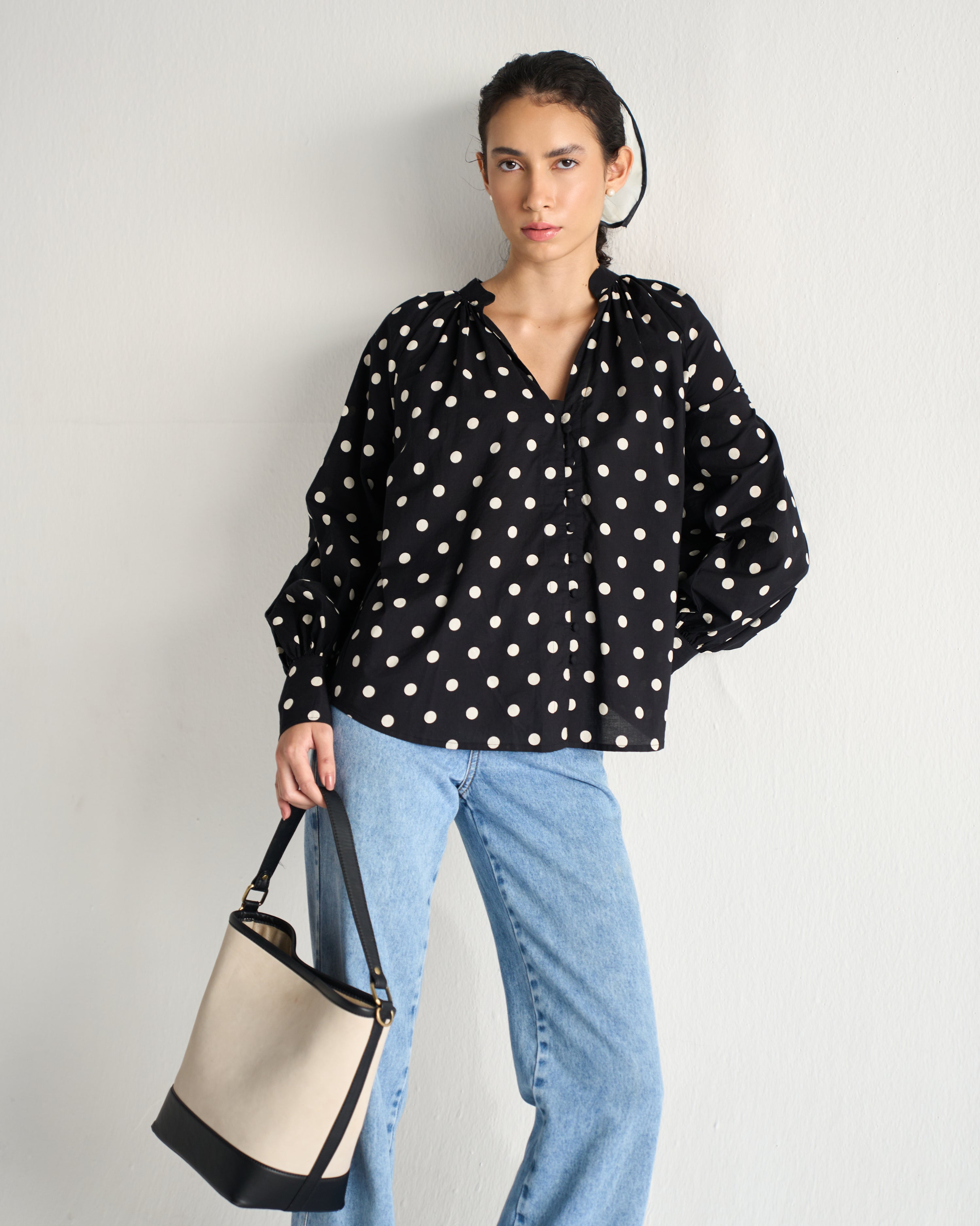 Lightweight woven fabric with ivory polka dots, V-neckline with subtle gathers for soft volume, Long sleeves with cuffed ends, Relaxed, easy-fit silhouette, Hip-length design, Perfect for tucking or layering