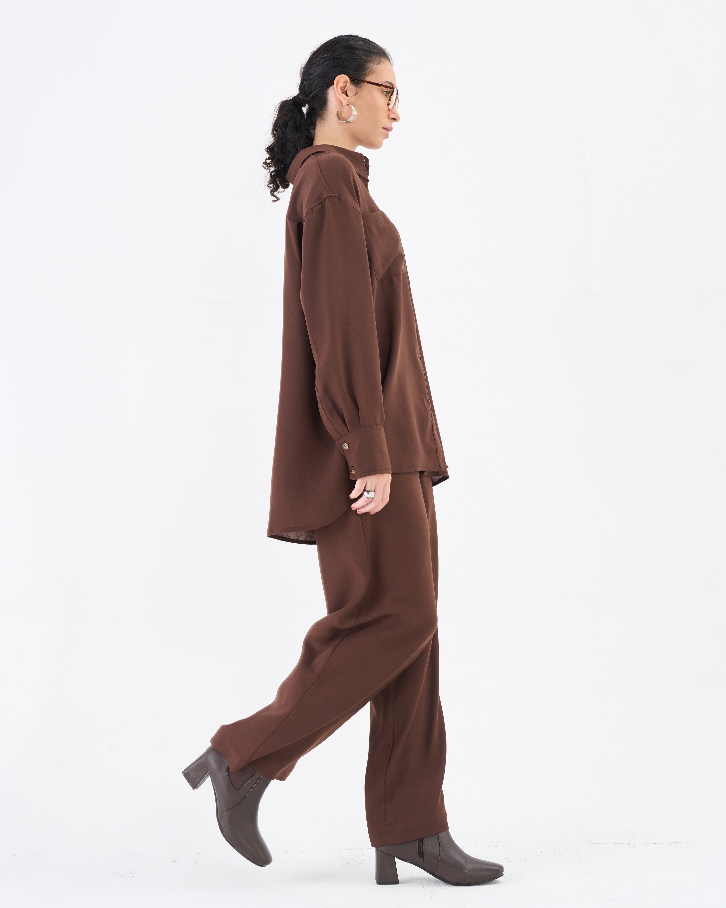 Cocoa Brown Co-ord Set with Relaxed Shirt & Wide-Leg Trousers
