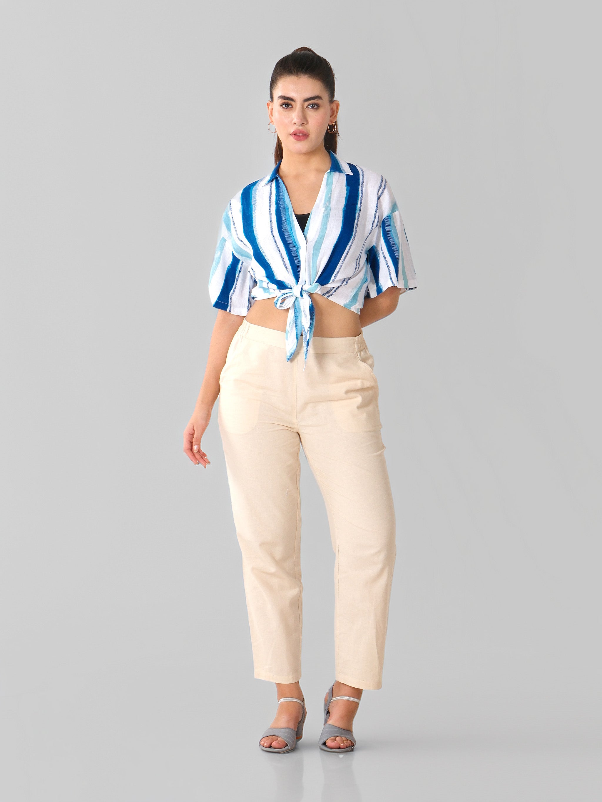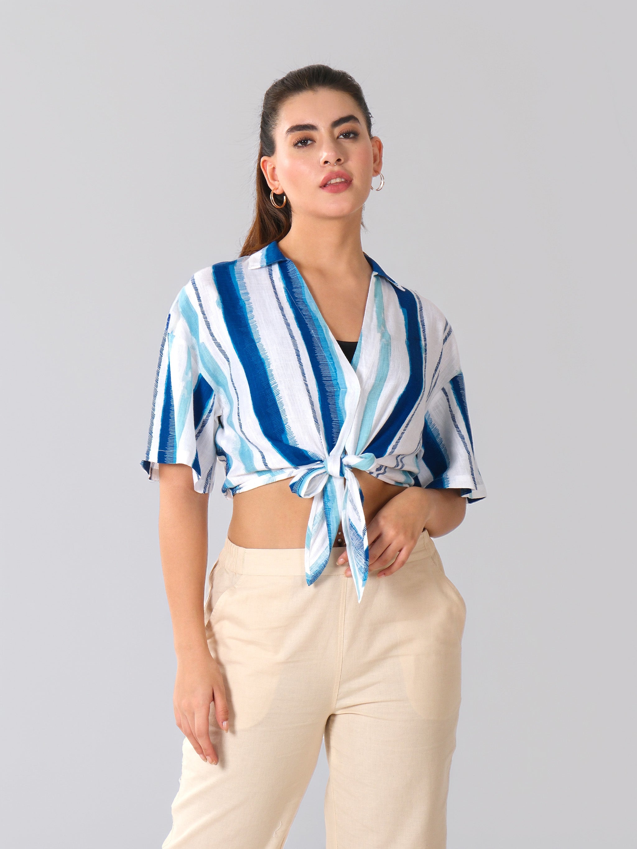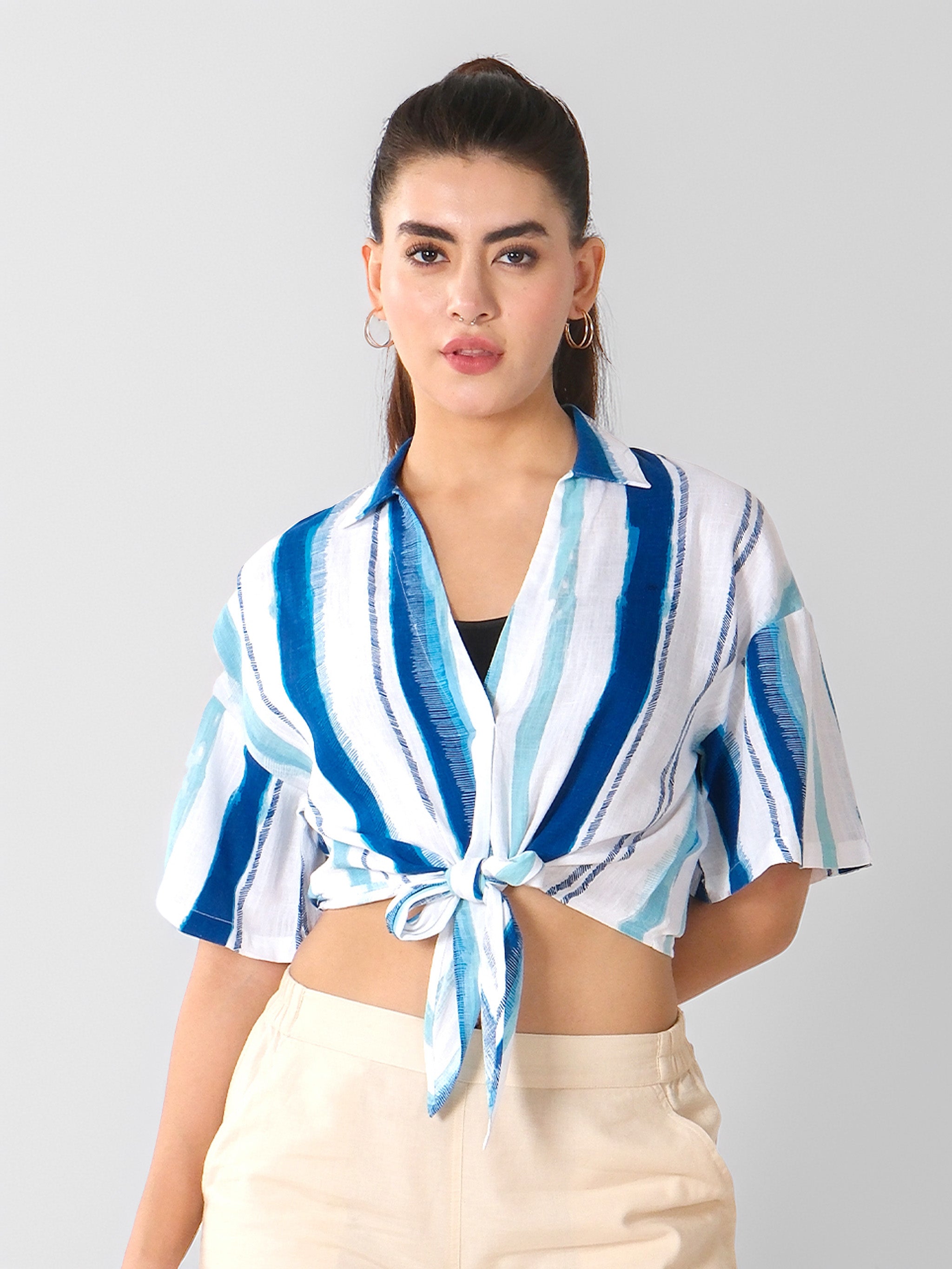 Made from soft, lightweight cotton blend fabric, Vertical blue and white stripe pattern for a fresh, elongating effect, Classic collar with short sleeves, Front tie-up design for adjustable styling, Relaxed cropped fit for an easy, laid-back look, Unlined and breathable, ideal for warm weather.