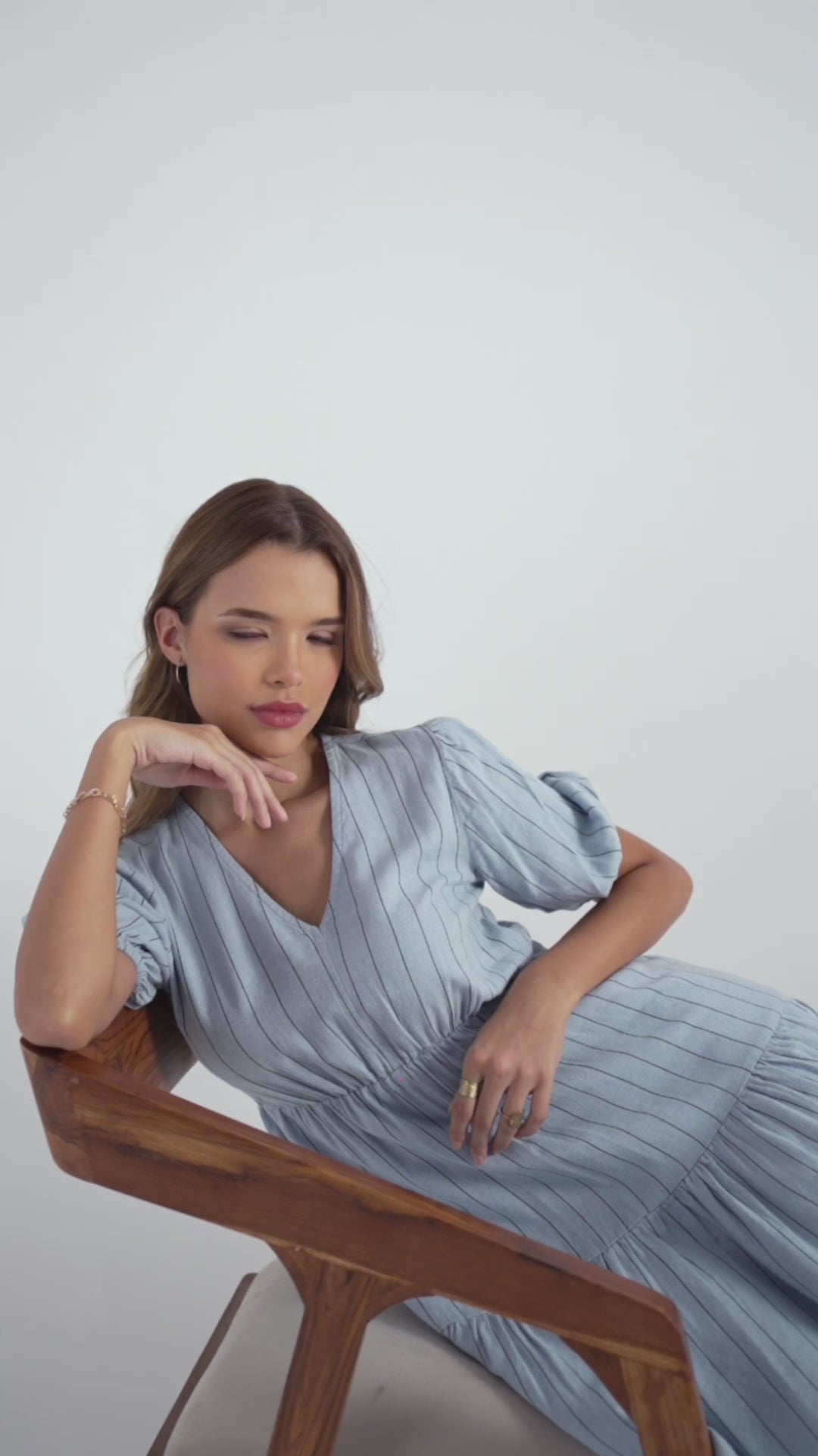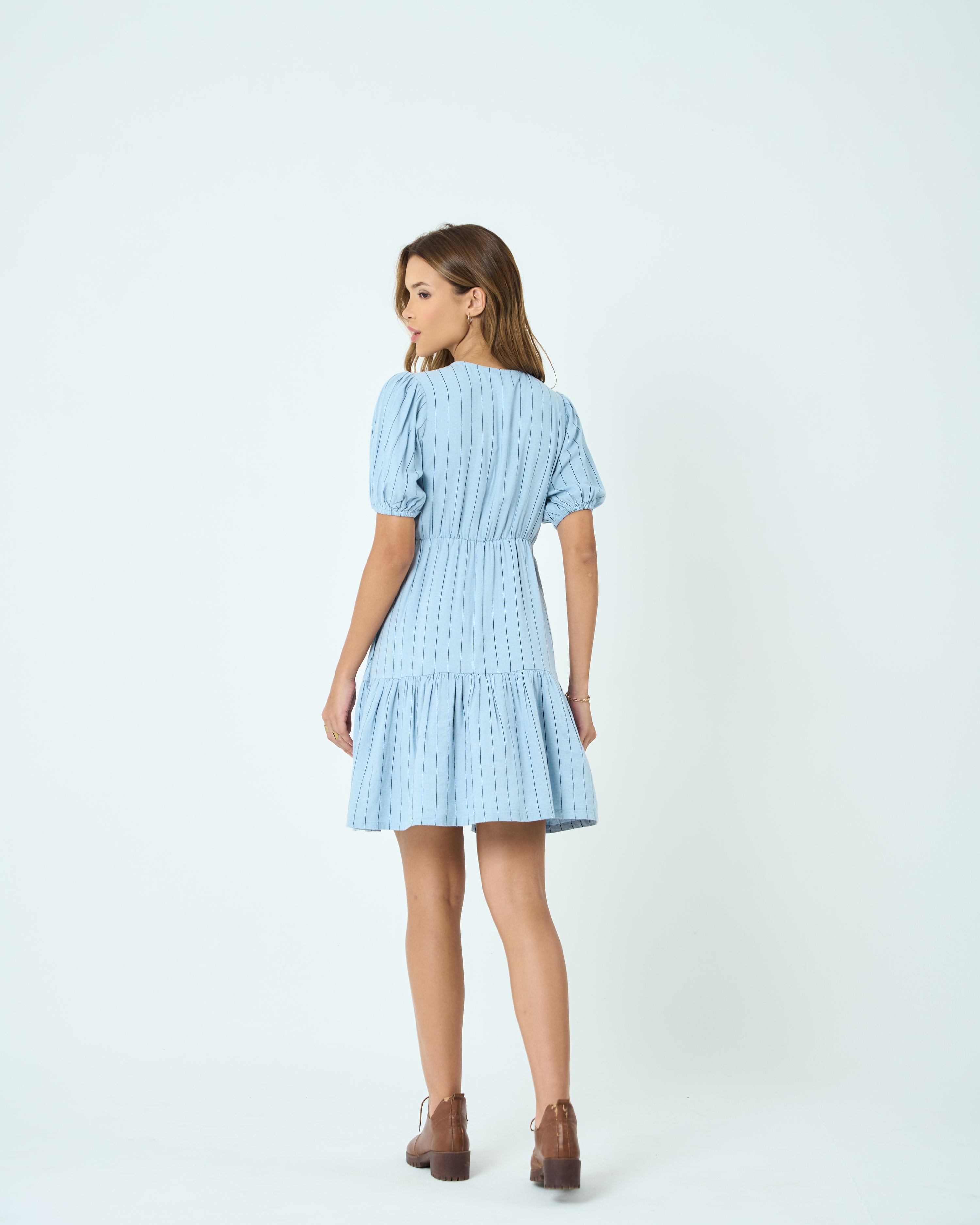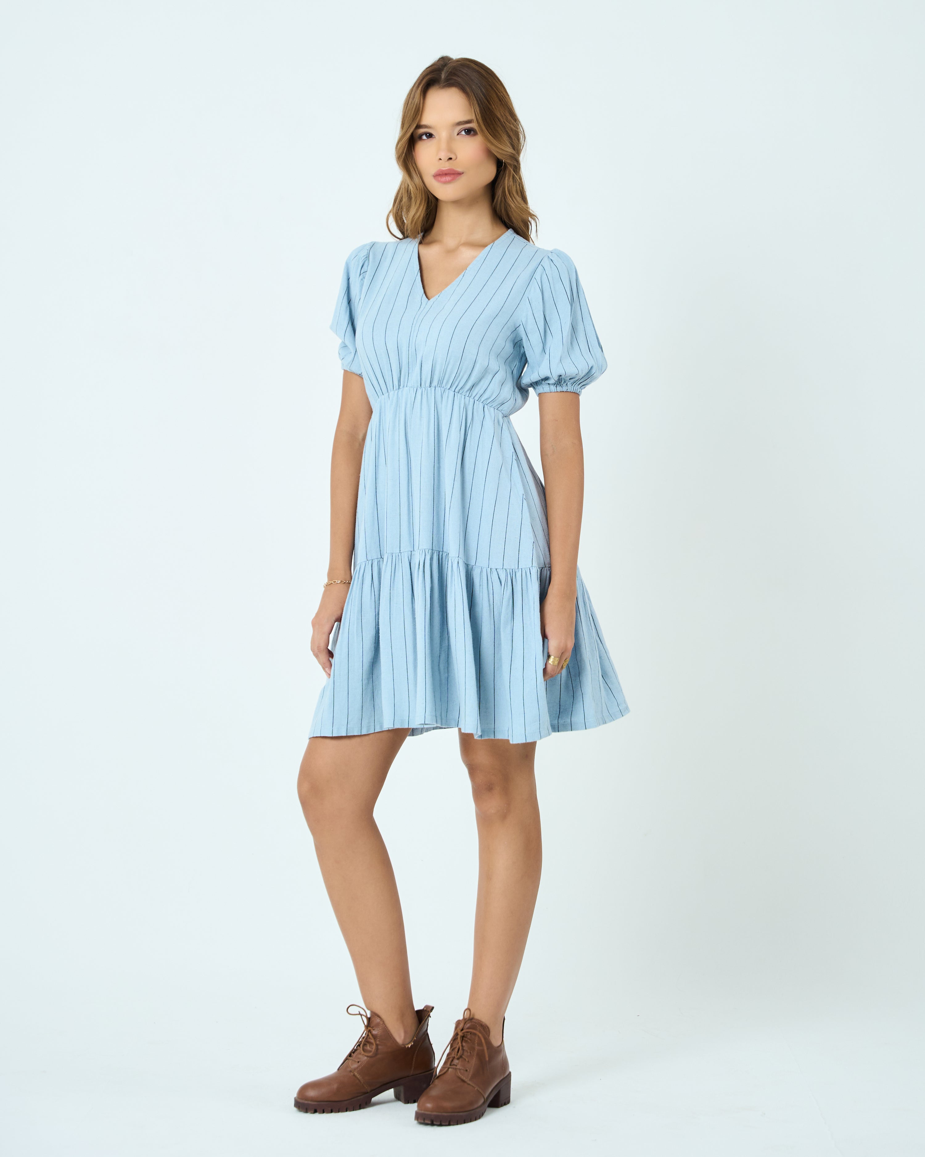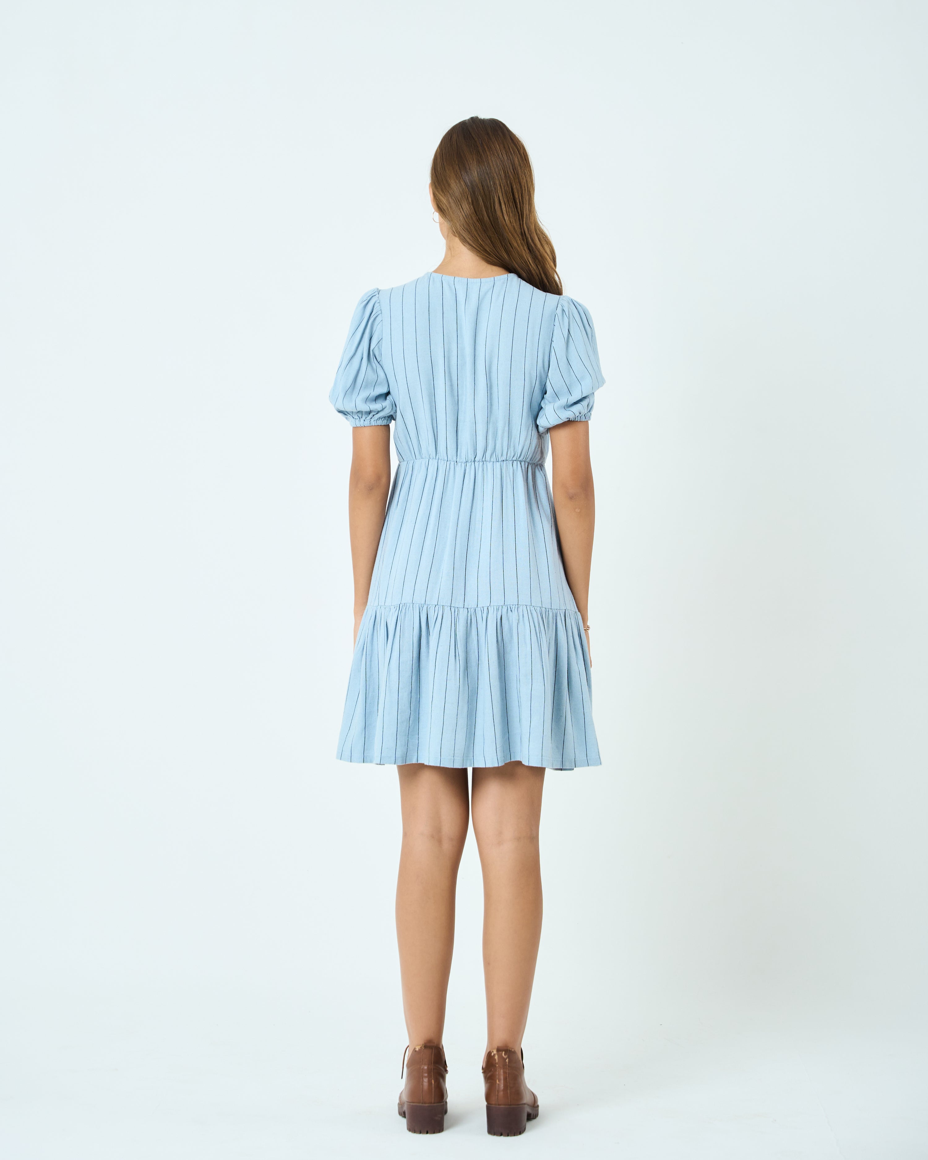 Lightweight cotton-blend fabric with vertical woven stripes, Flattering V-neckline with subtle gathers, Short puff sleeves with elasticated cuffs, Empire waist for a defined, easy fit, Tiered skirt for soft movement and volume, Above-knee length for a playful finish, Fully lined for comfort
