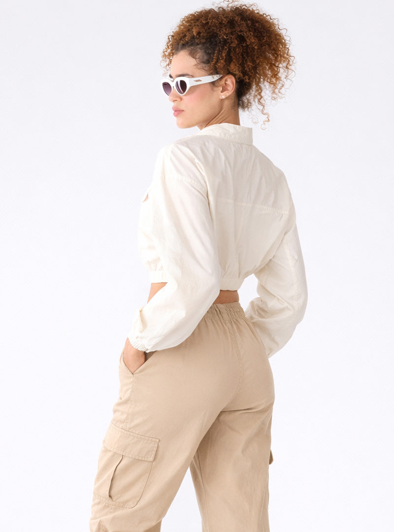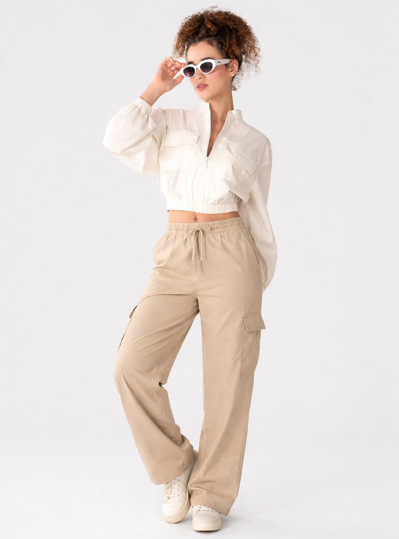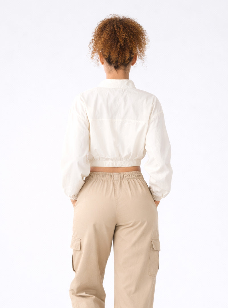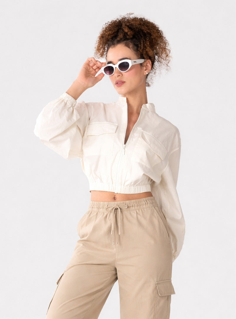 Soft cotton-blend fabric with smooth texture, Stand collar with front zip closure, Full sleeves with elasticated cuffs , Cropped length with gathered elastic hem, Utility-inspired front flap pockets, Relaxed silhouette for easy movement.