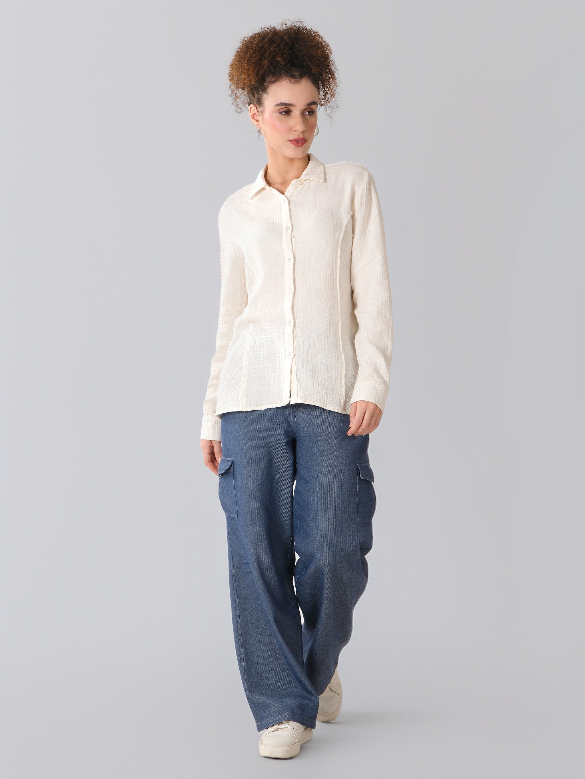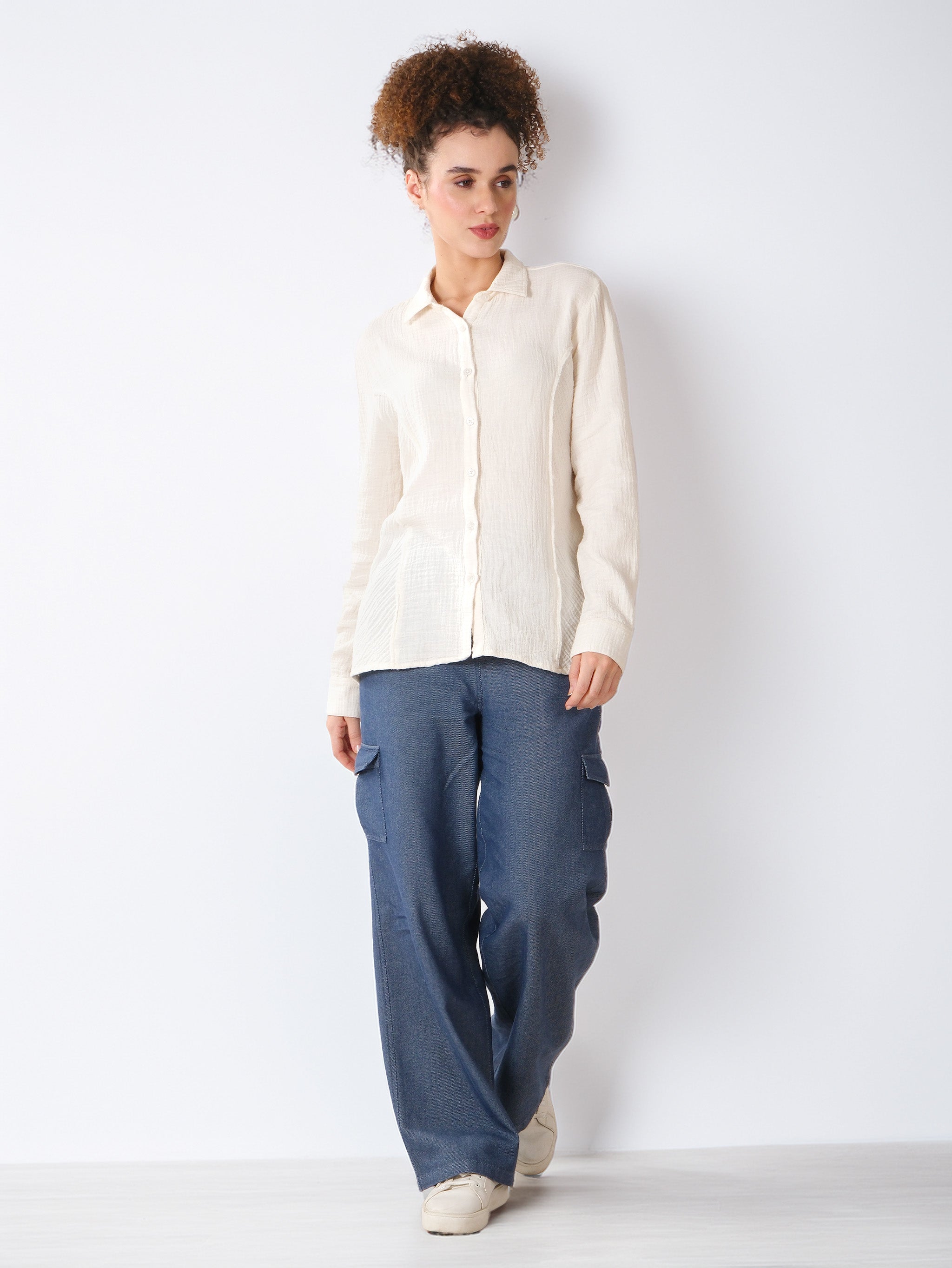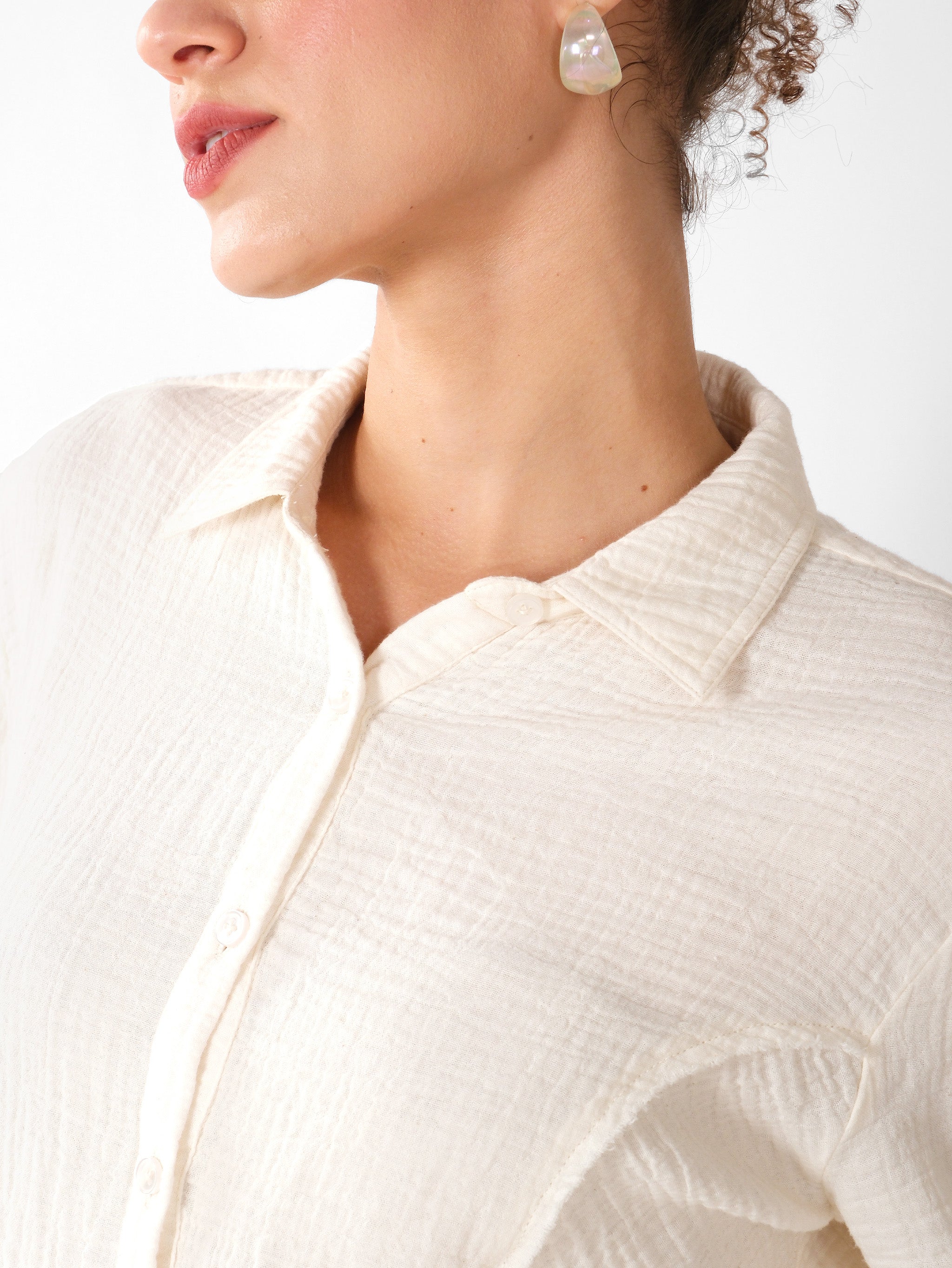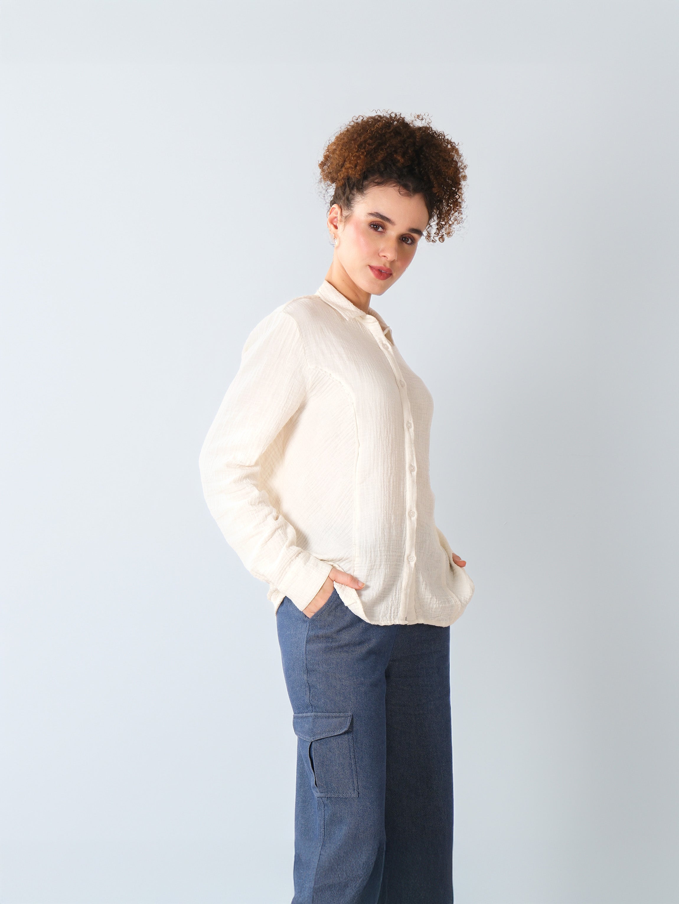 Made from lightweight textured cotton fabric for natural breathability, Classic shirt collar with button-down front, Drop-shoulder design for a relaxed, laid-back look, Long sleeves with wide cuffs for a soft, casual touch, Slightly curved hem for easy tucking or layering versatility.