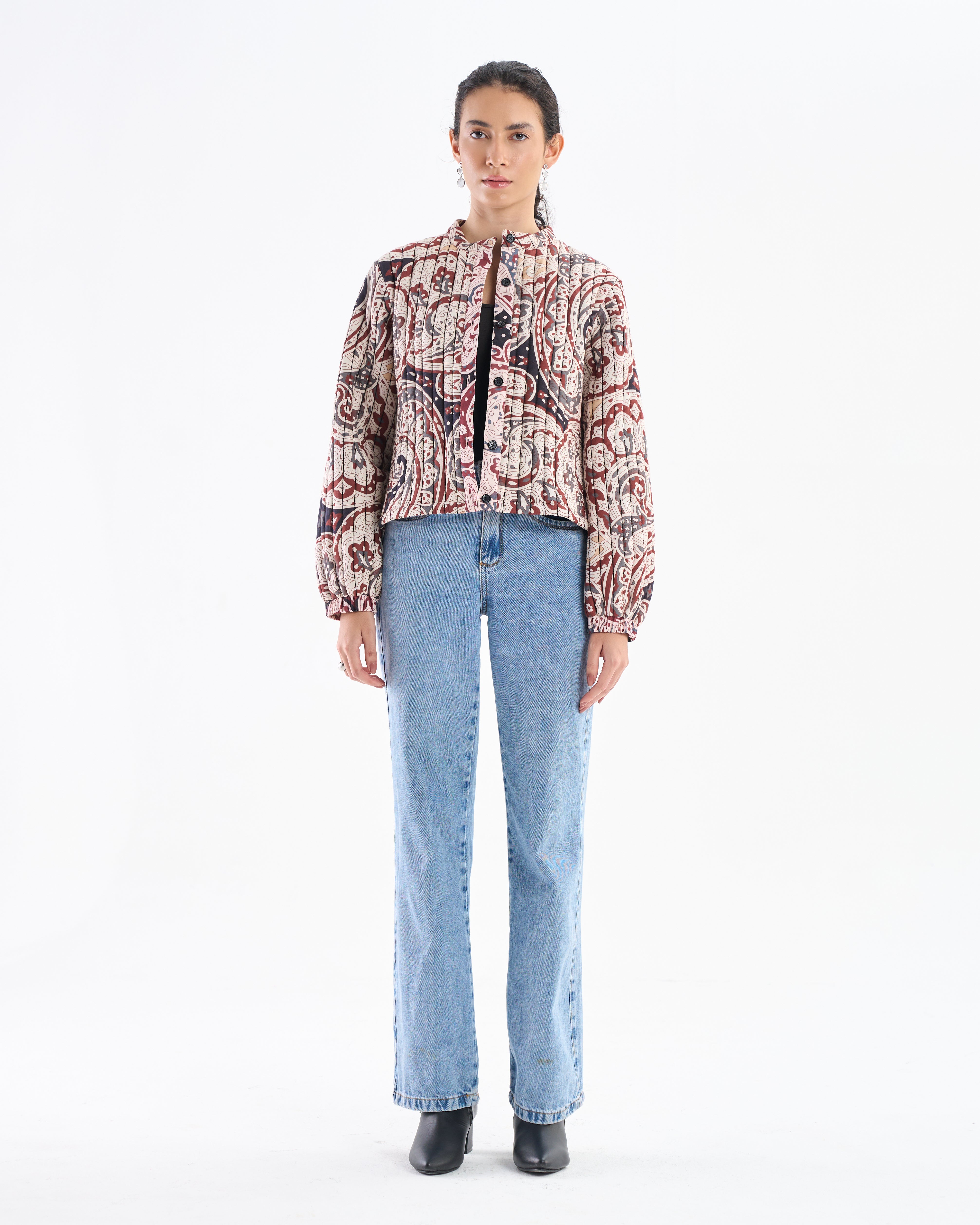 Soft quilted fabric with multicolor paisley print Front snap-button closure Round neckline with subtle stand collar Long sleeves with elasticated cuffs Cropped, boxy silhouette for a modern fit Lightly padded for comfort and layering