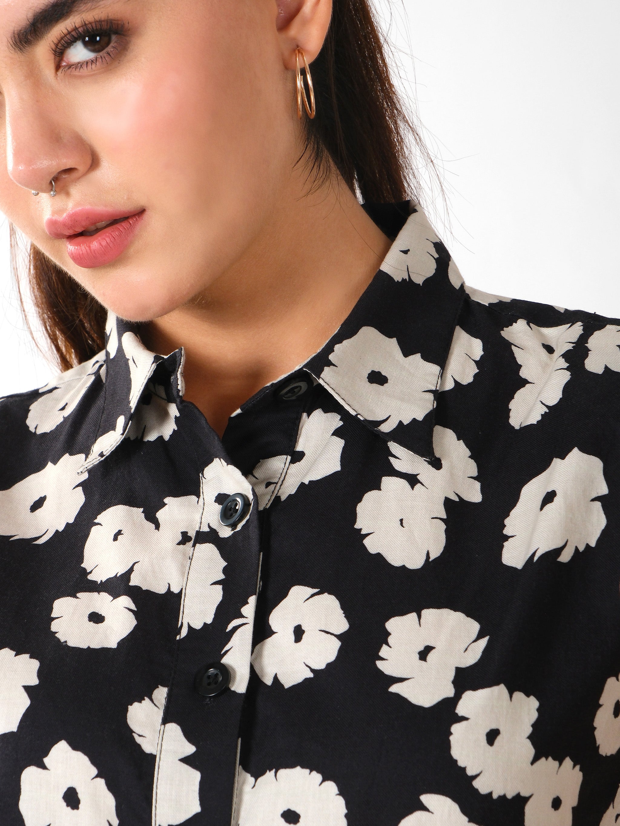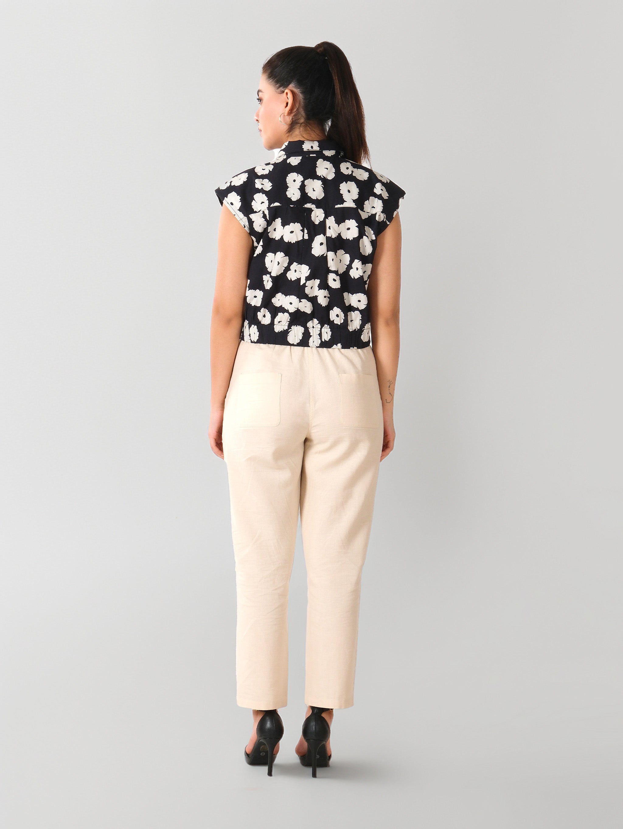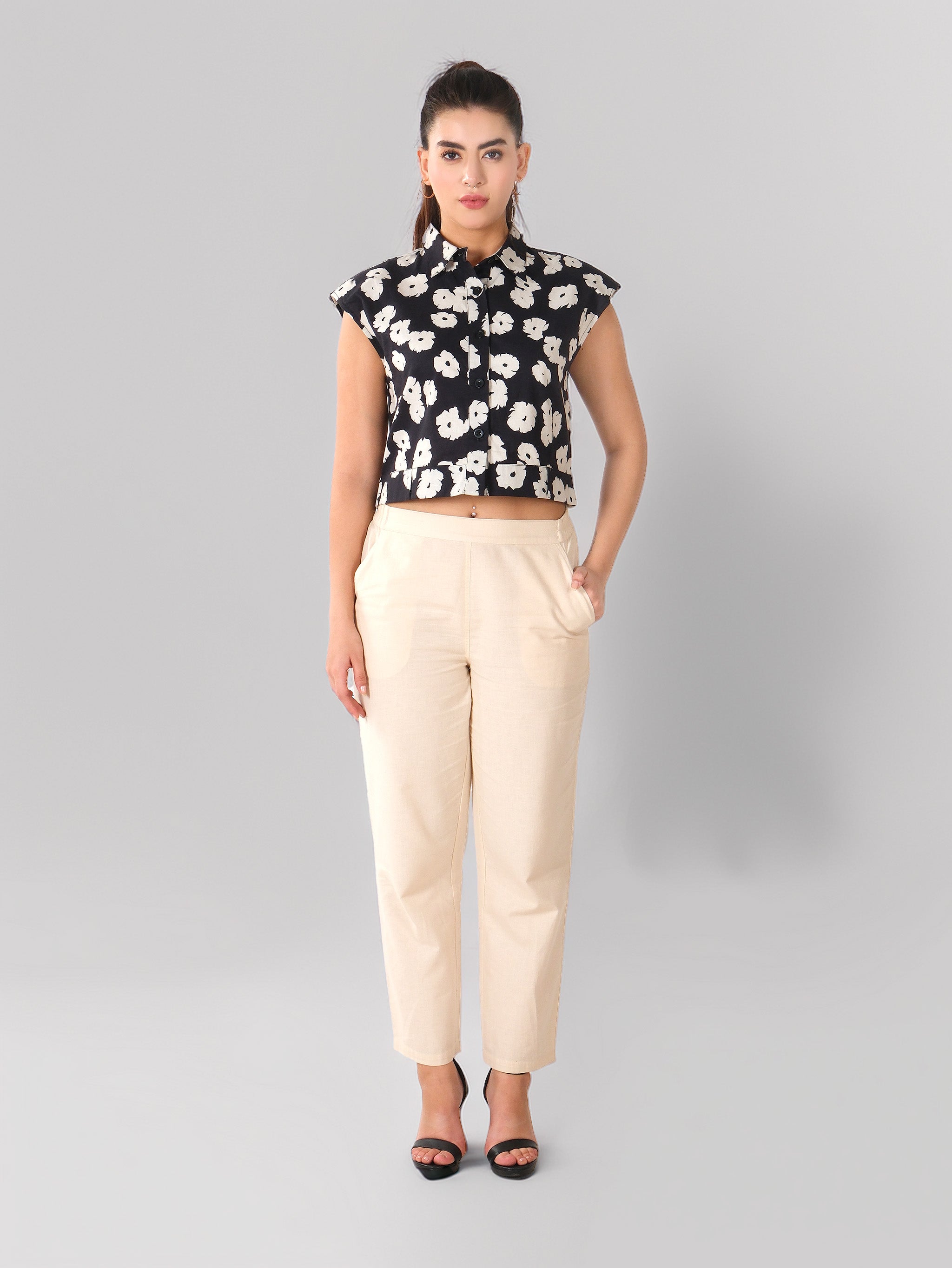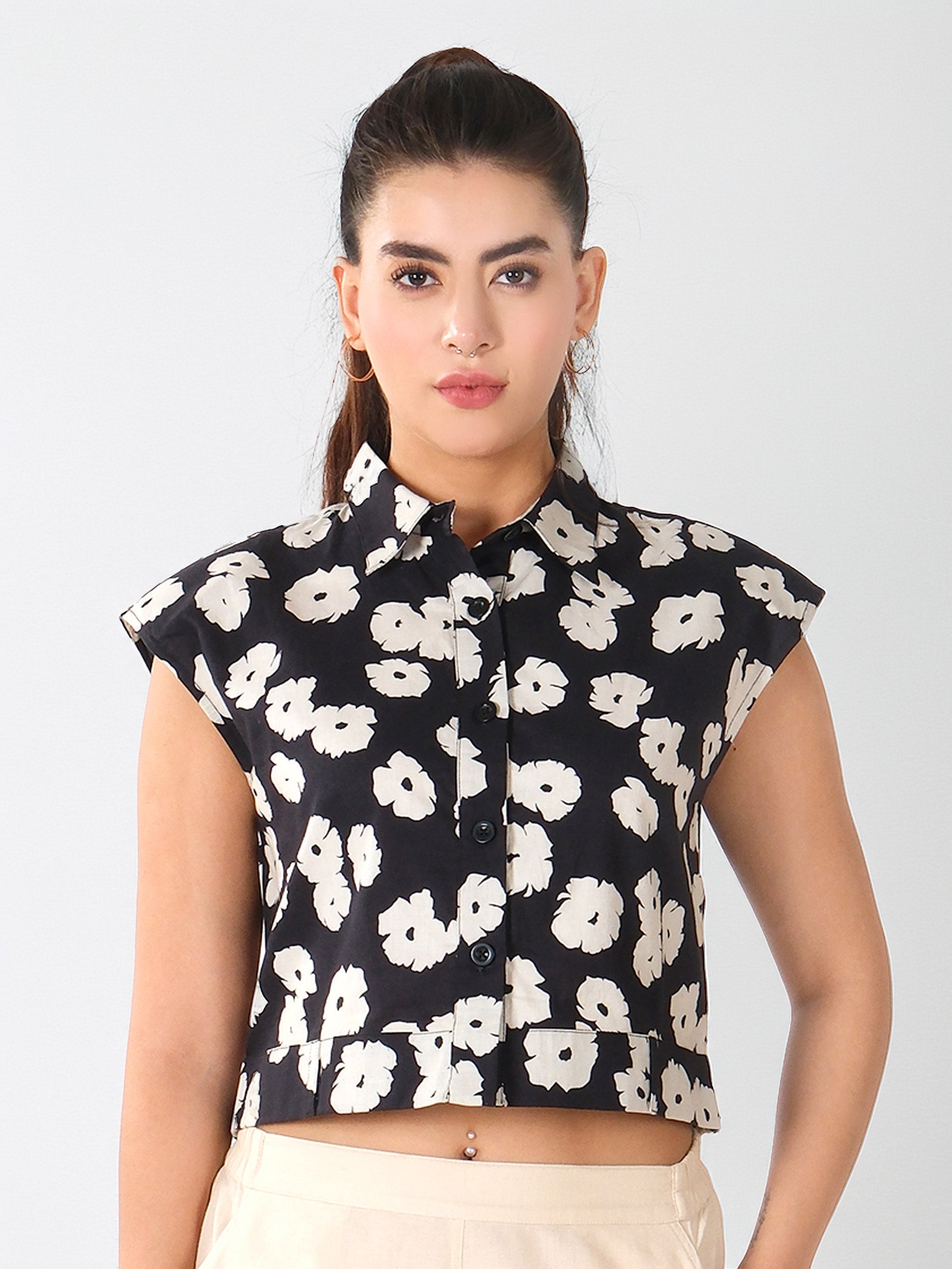 Soft, breathable fabric with all-over ivory floral print, Structured crop silhouette with button-down front, Spread collar and capped sleeves for a sharp, feminine look, Straight hem with minimal detailing for a clean finish, Lightweight and versatile for all-day wear.