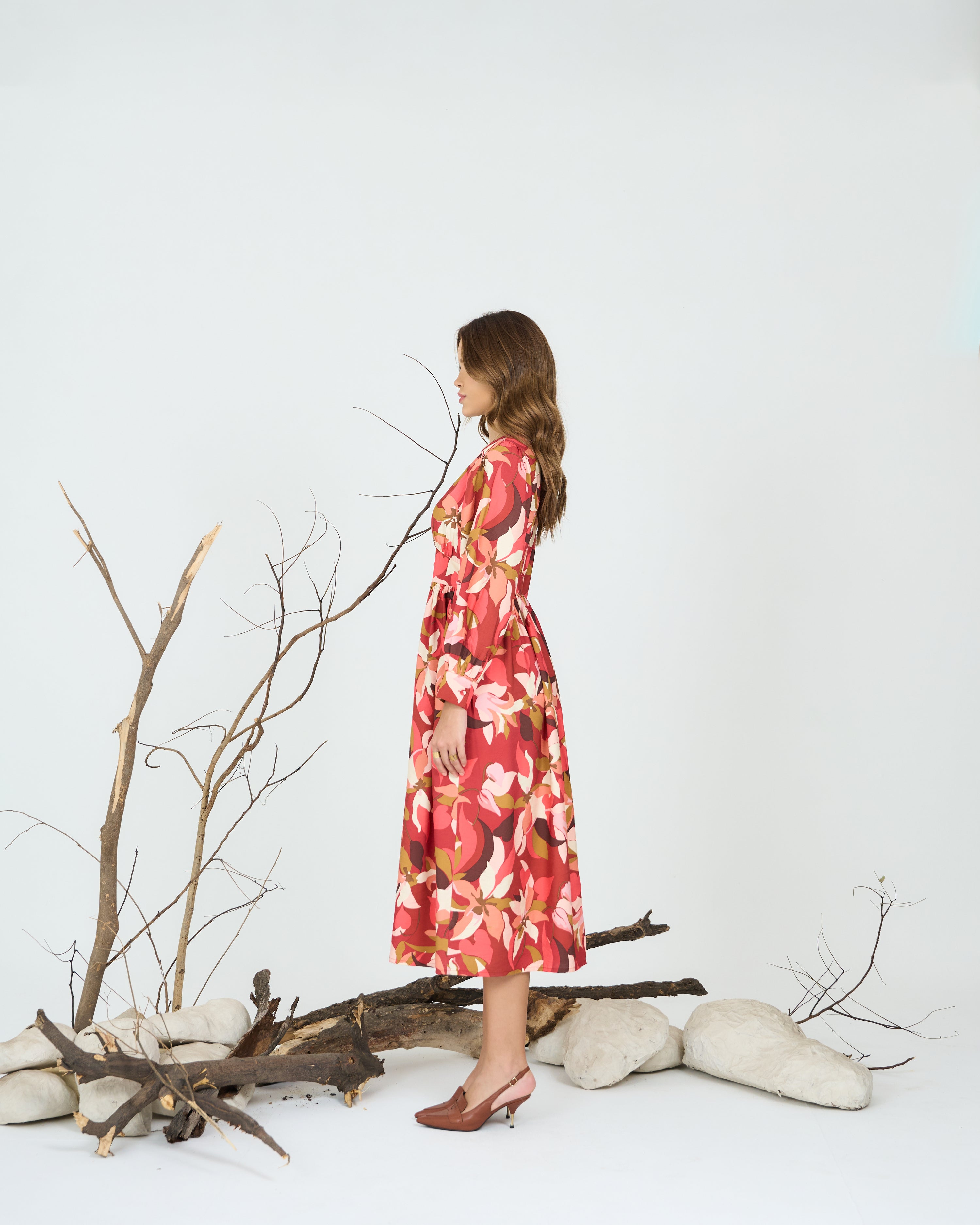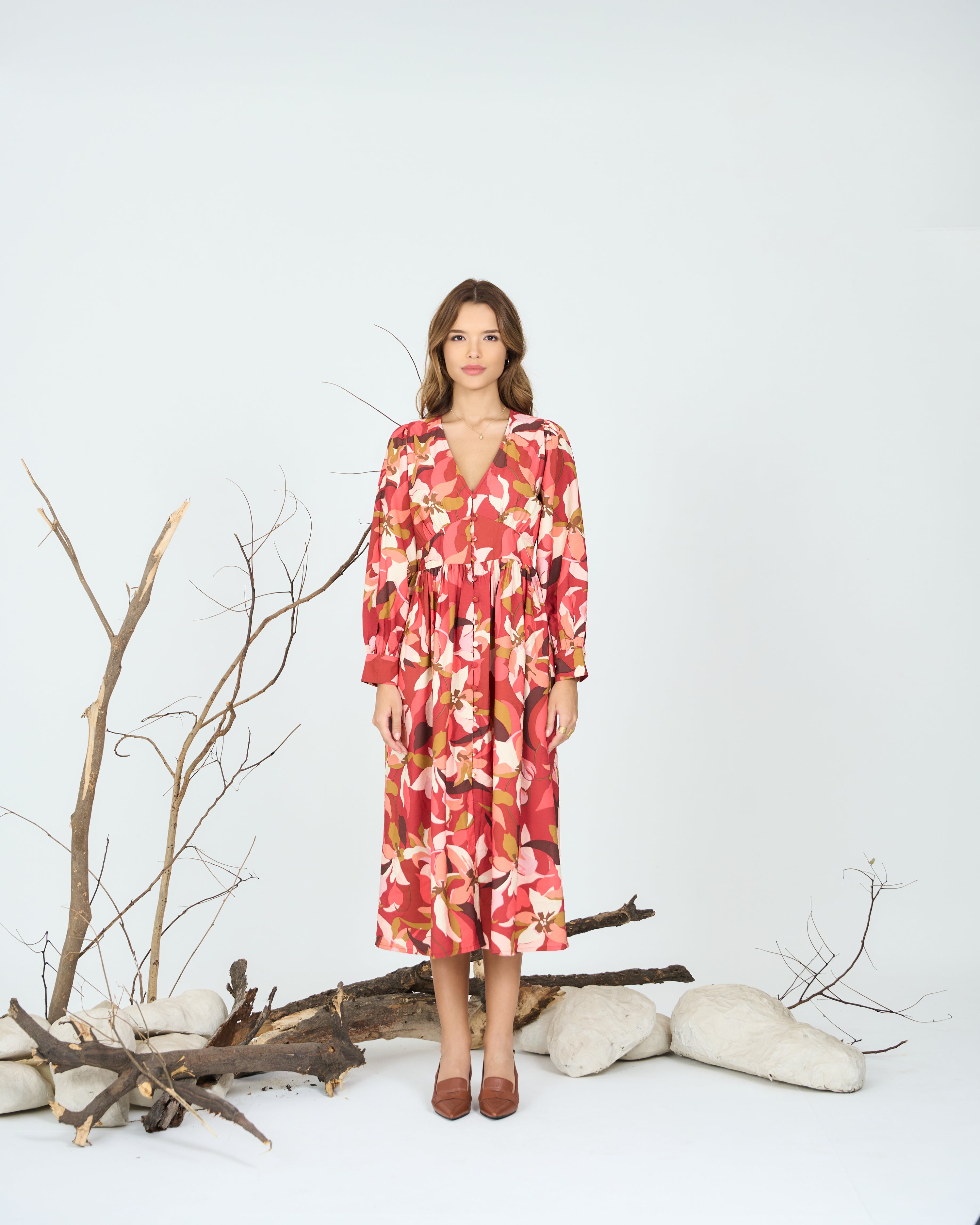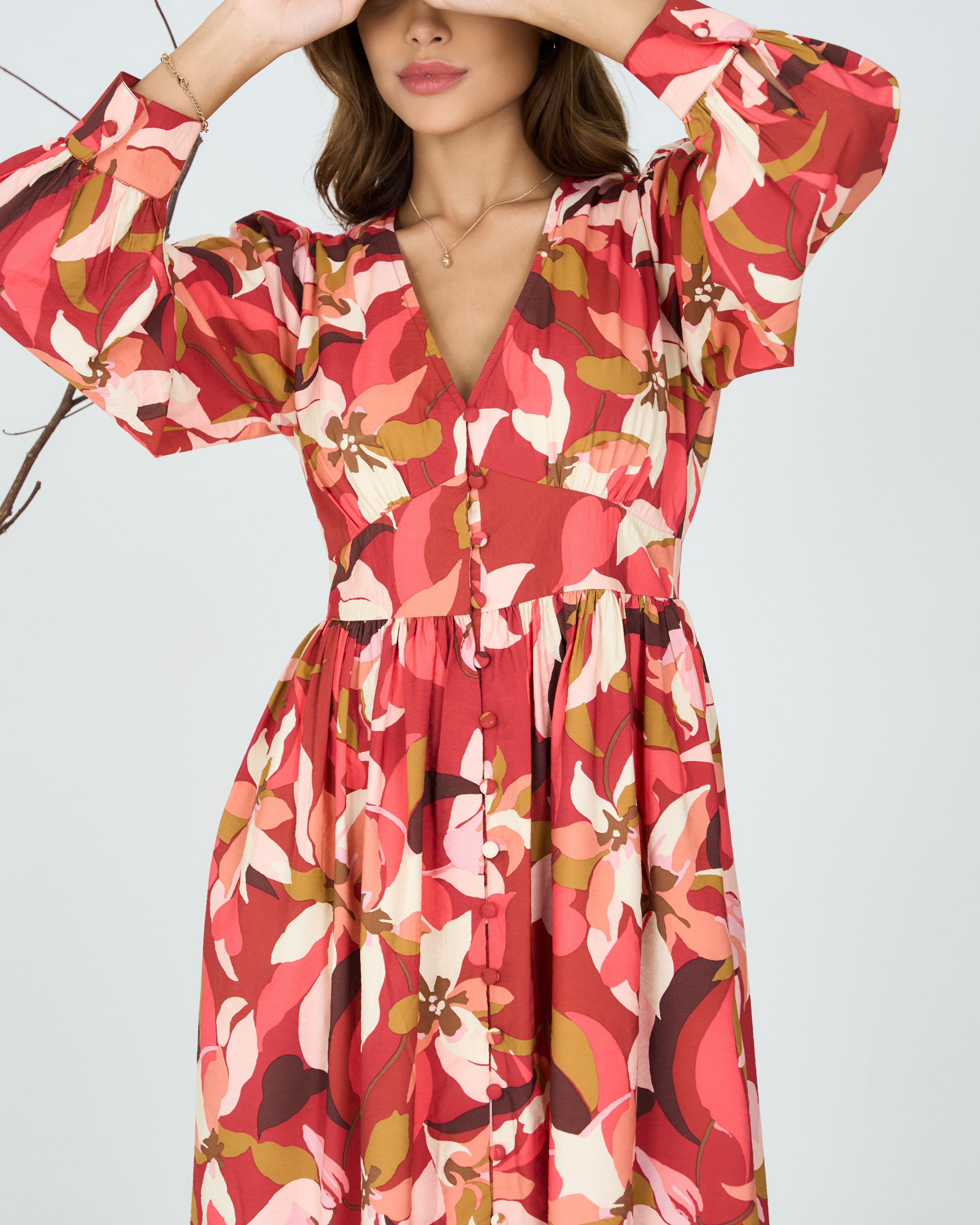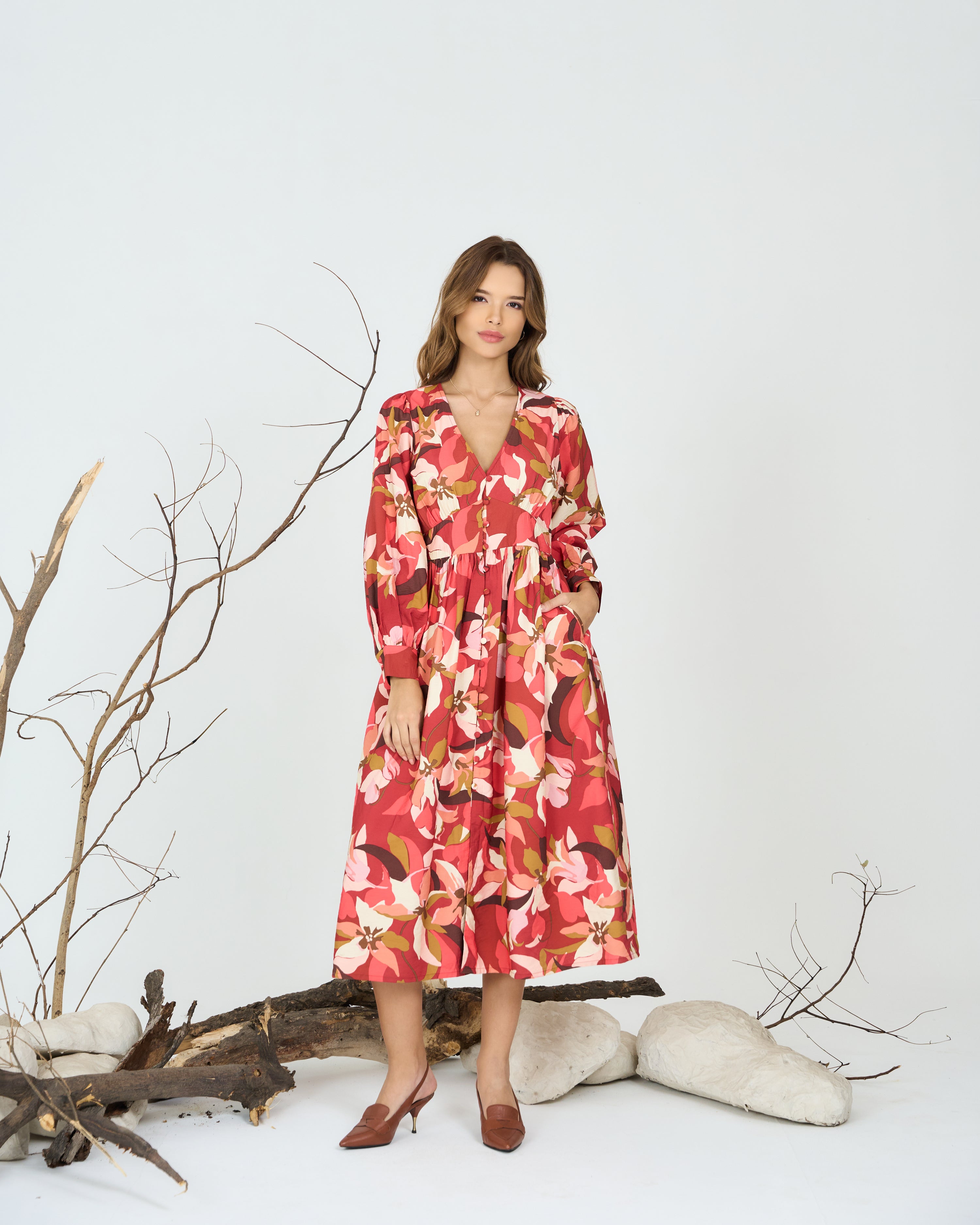 Crafted from soft, breathable fabric with an all-over abstract floral print, Deep V-neckline for a flattering fit, Full sleeves with buttoned cuffs for a refined finish, Gathered waist detailing for a voluminous fall, Midi length with a relaxed silhouette, Unlined for natural movement and comfort.