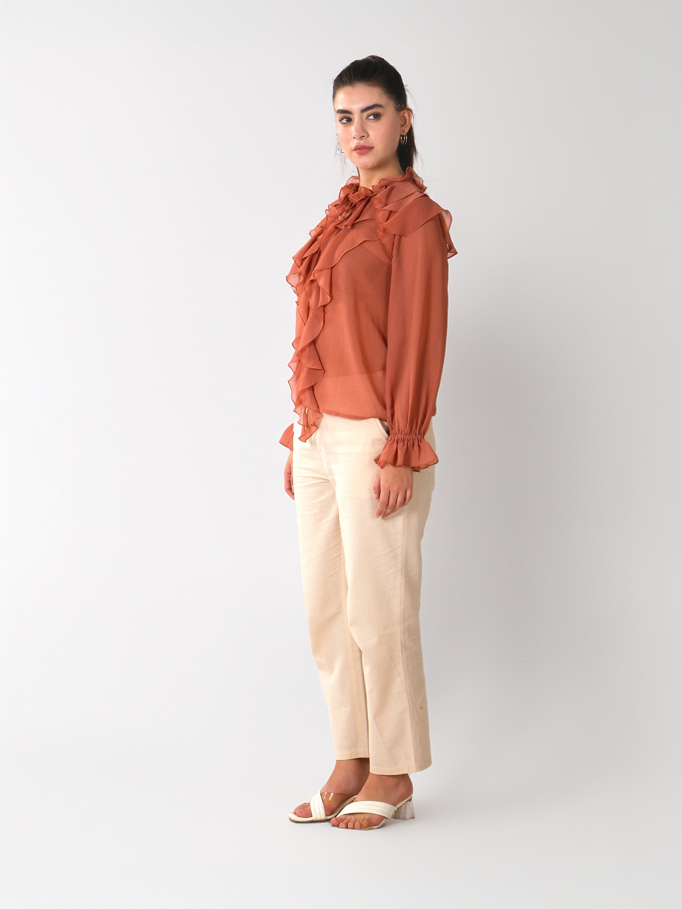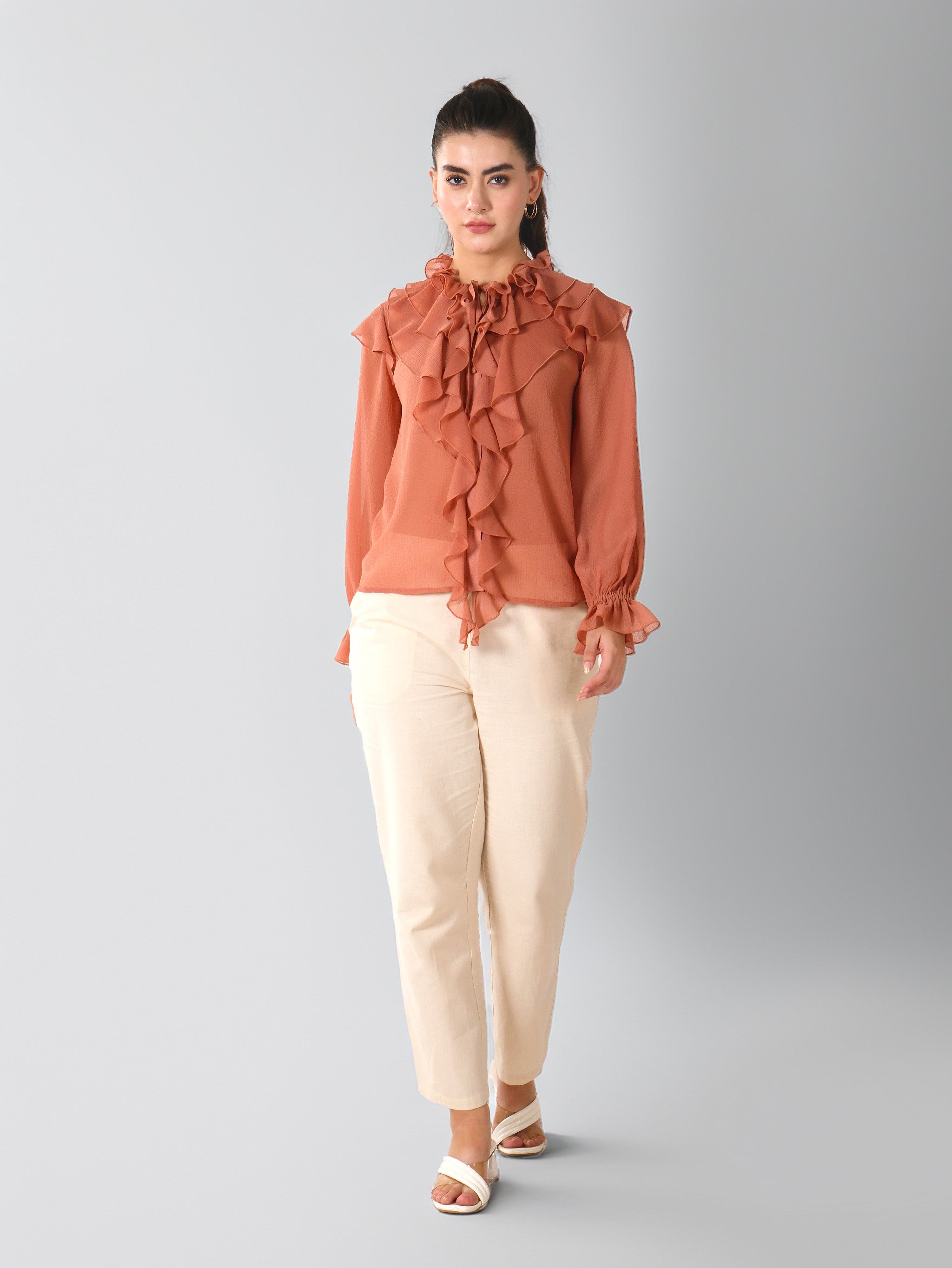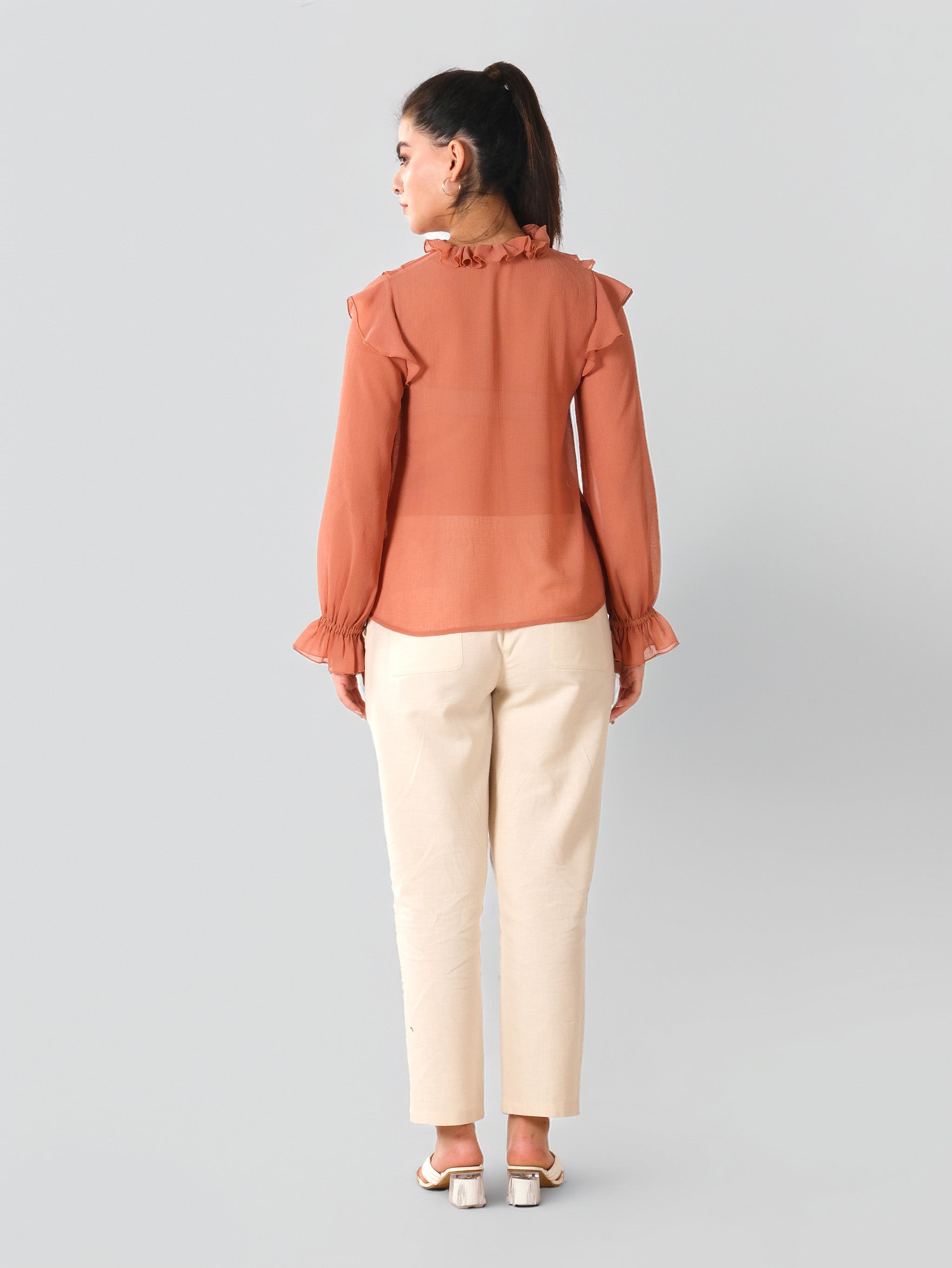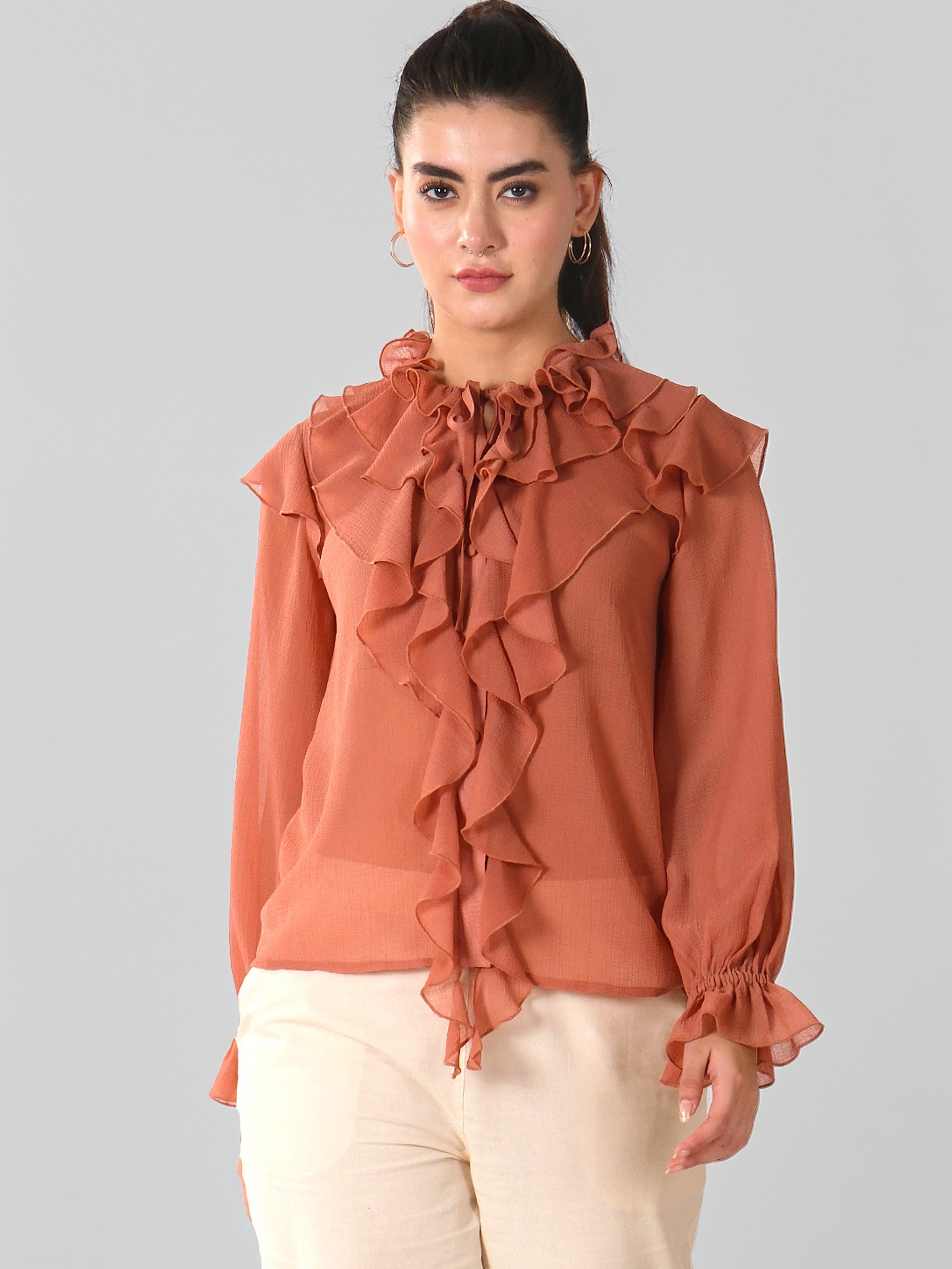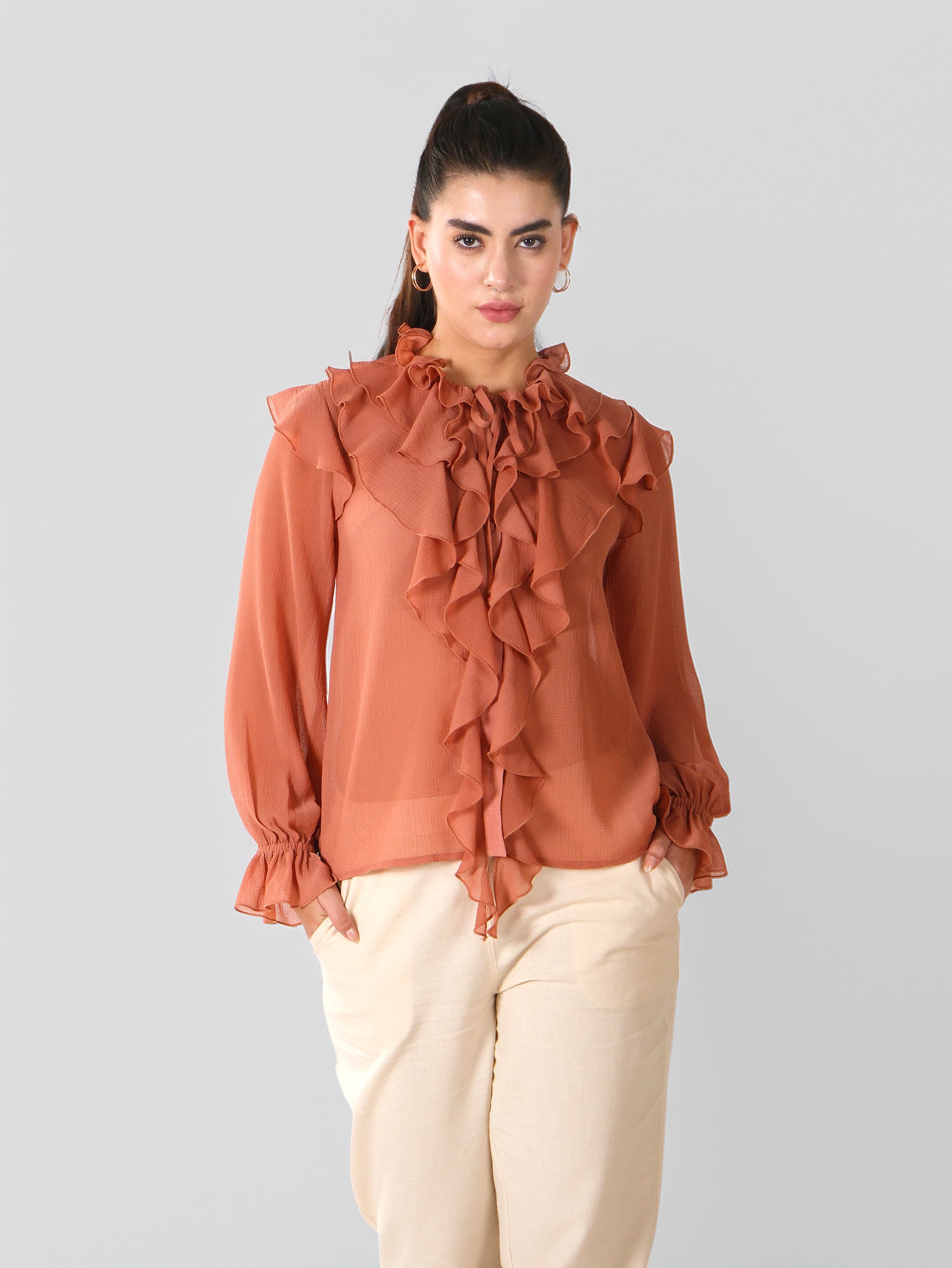 Soft textured chiffon fabric with a fluid drape, High neckline with tie-up detailing, Front and shoulder ruffles add a feminine flourish, Long sleeves with elasticated ruffle cuffs, Relaxed fit for all-day comfort, Unlined body with sheer sleeves for a soft, elegant look.