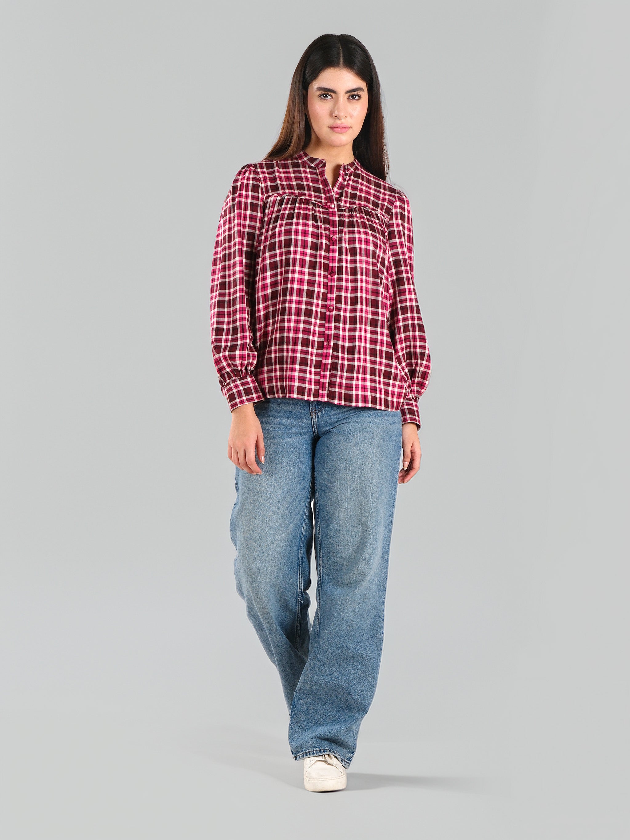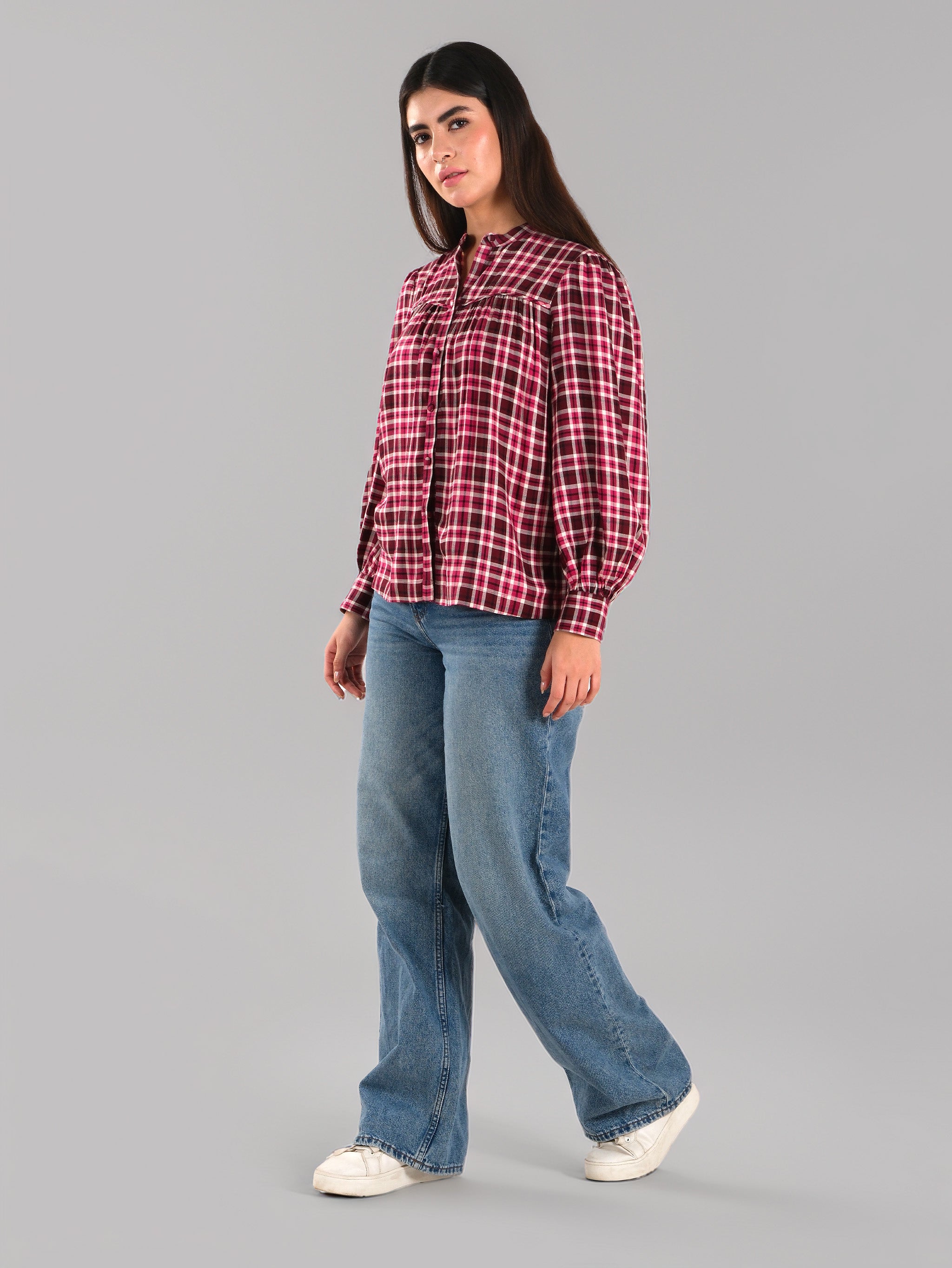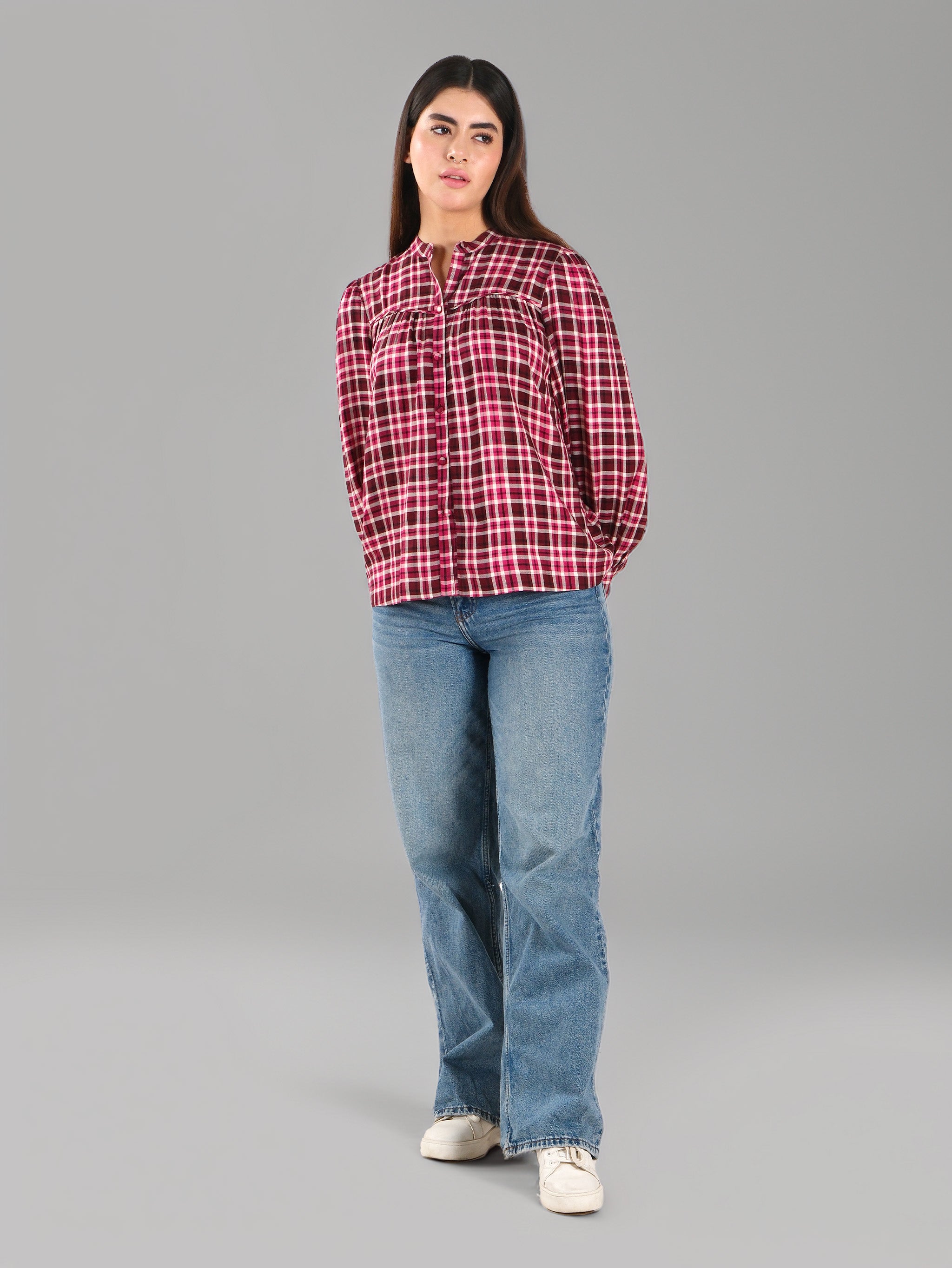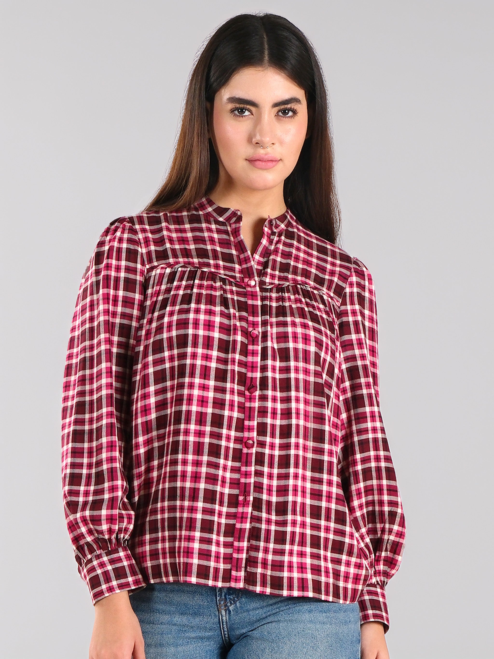 Soft cotton fabric with vibrant maroon and pink check pattern, Mandarin collar with a front button placket, Subtle gathers at the yoke for a relaxed silhouette, Full-length sleeves with buttoned cuffs, Curved hemline for a flattering fall.