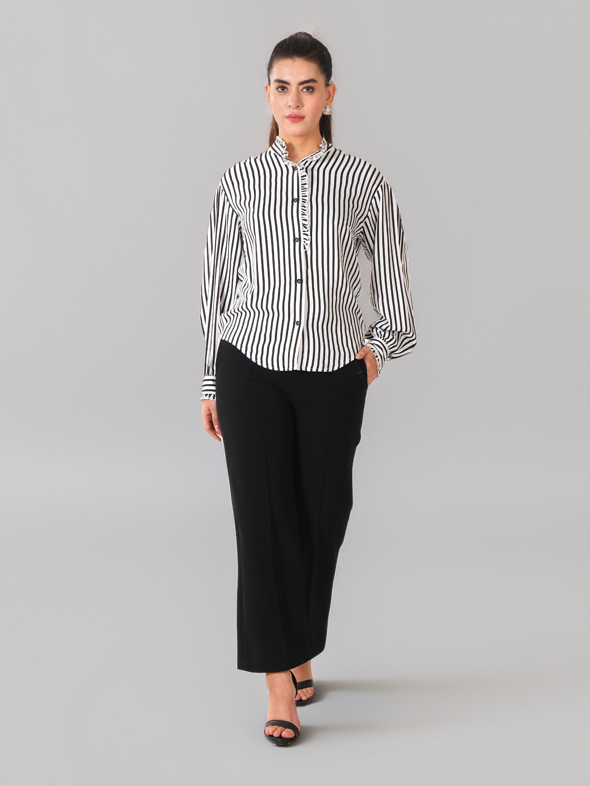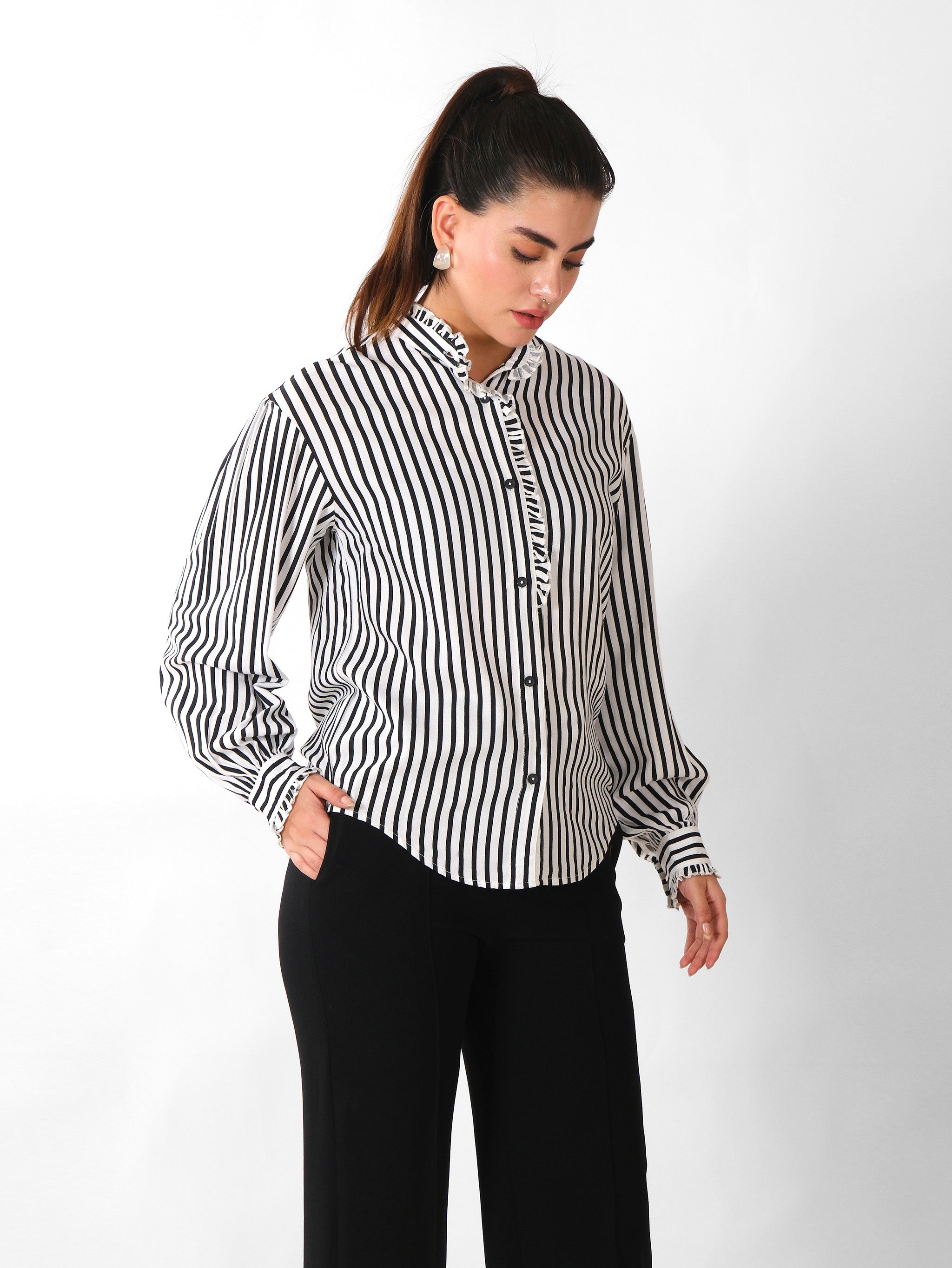 Crafted from soft, breathable cotton blend fabric, Black and white vertical stripes for a sleek elongated look, Delicate ruffle trim along the stand collar and button placket, Full button-down front with long sleeves and buttoned cuffs, Relaxed fit for easy styling and all-day comfort.