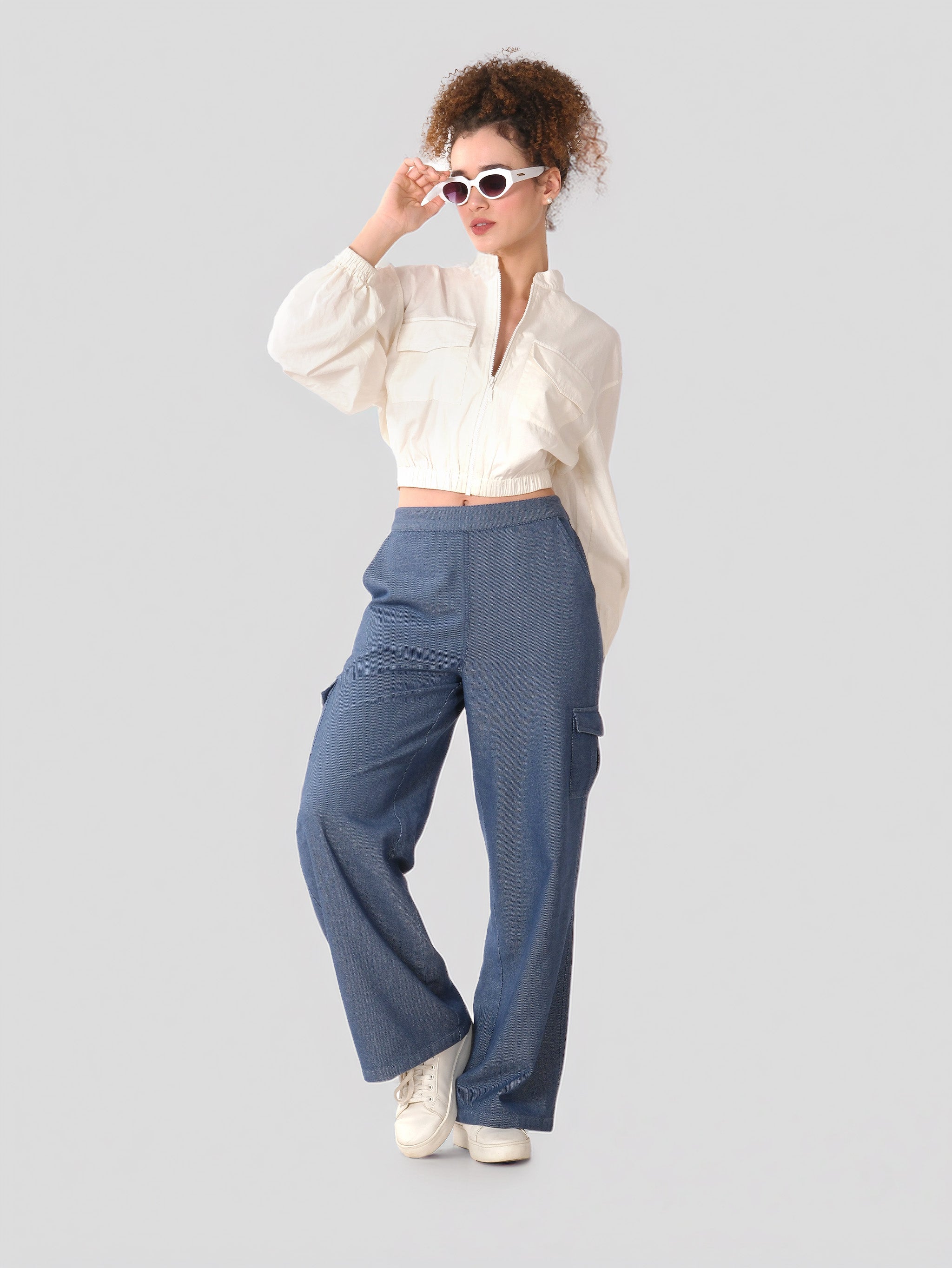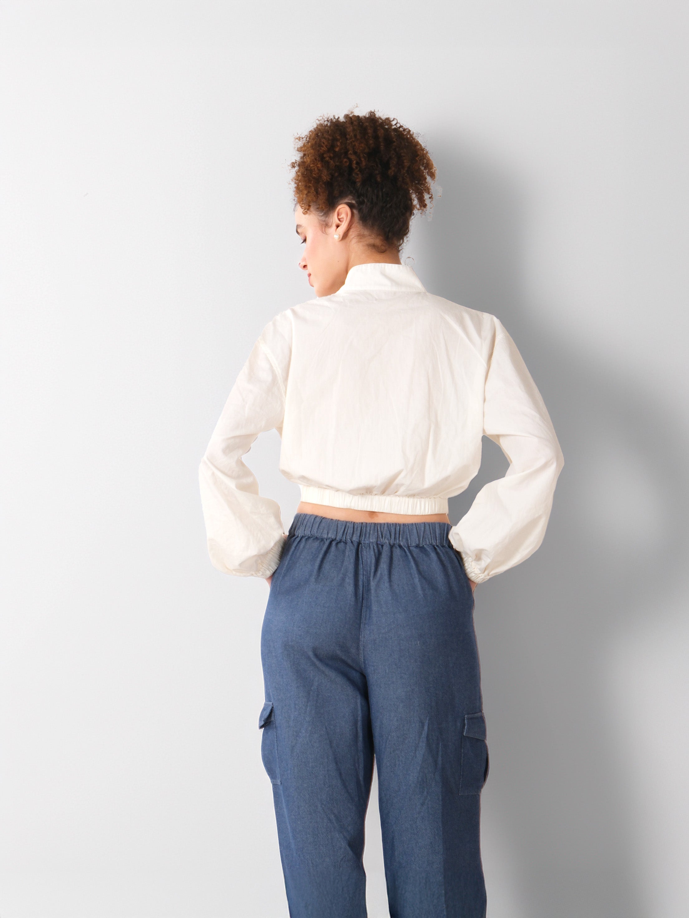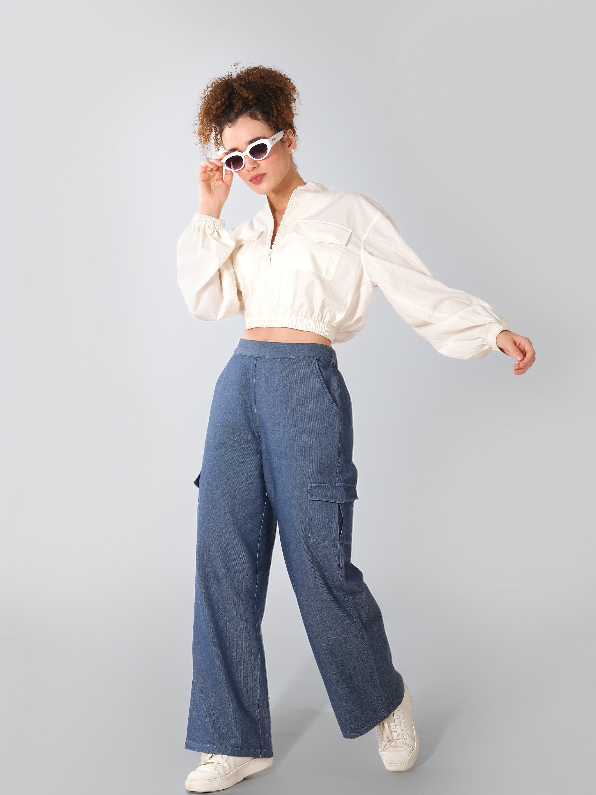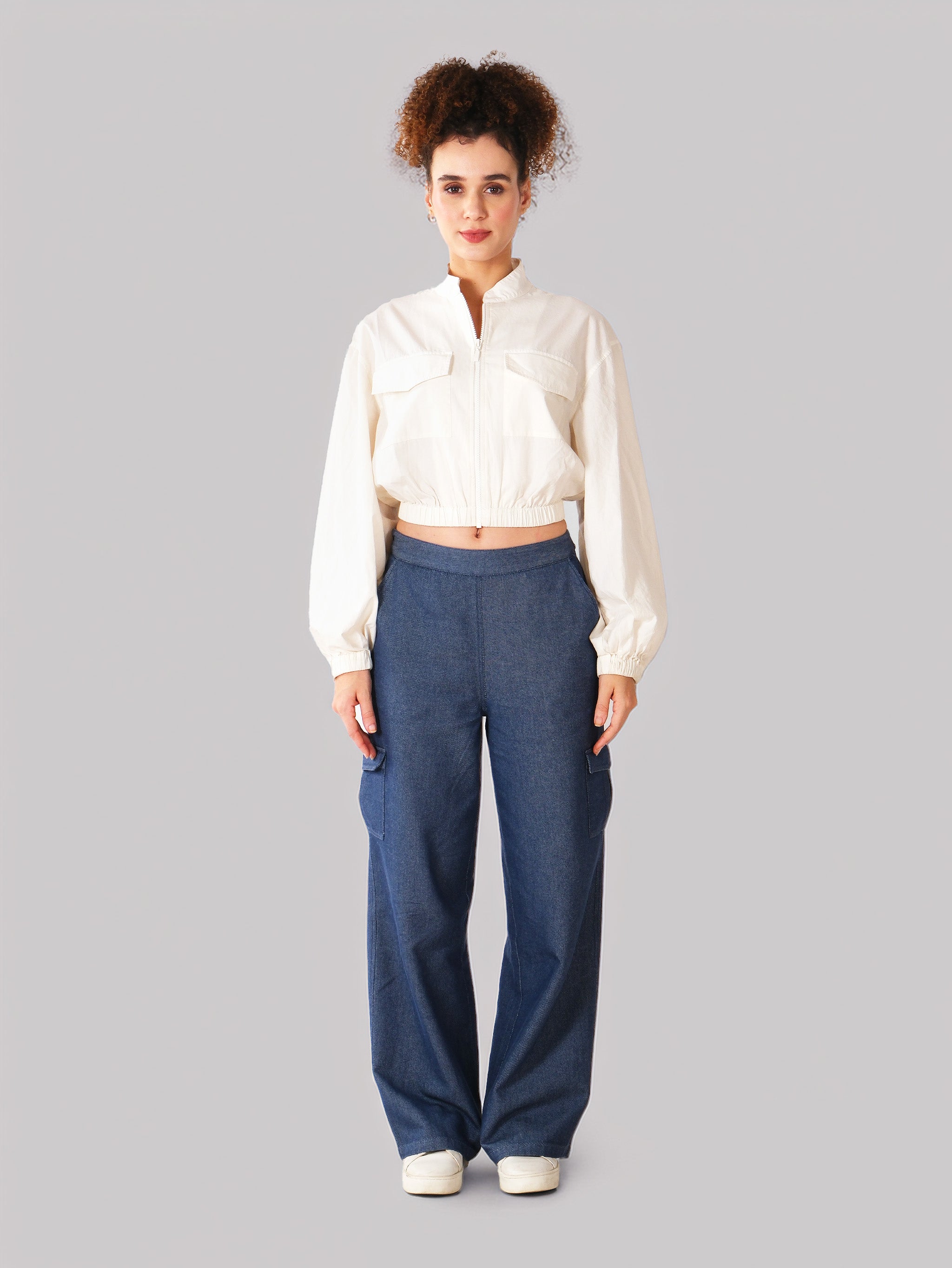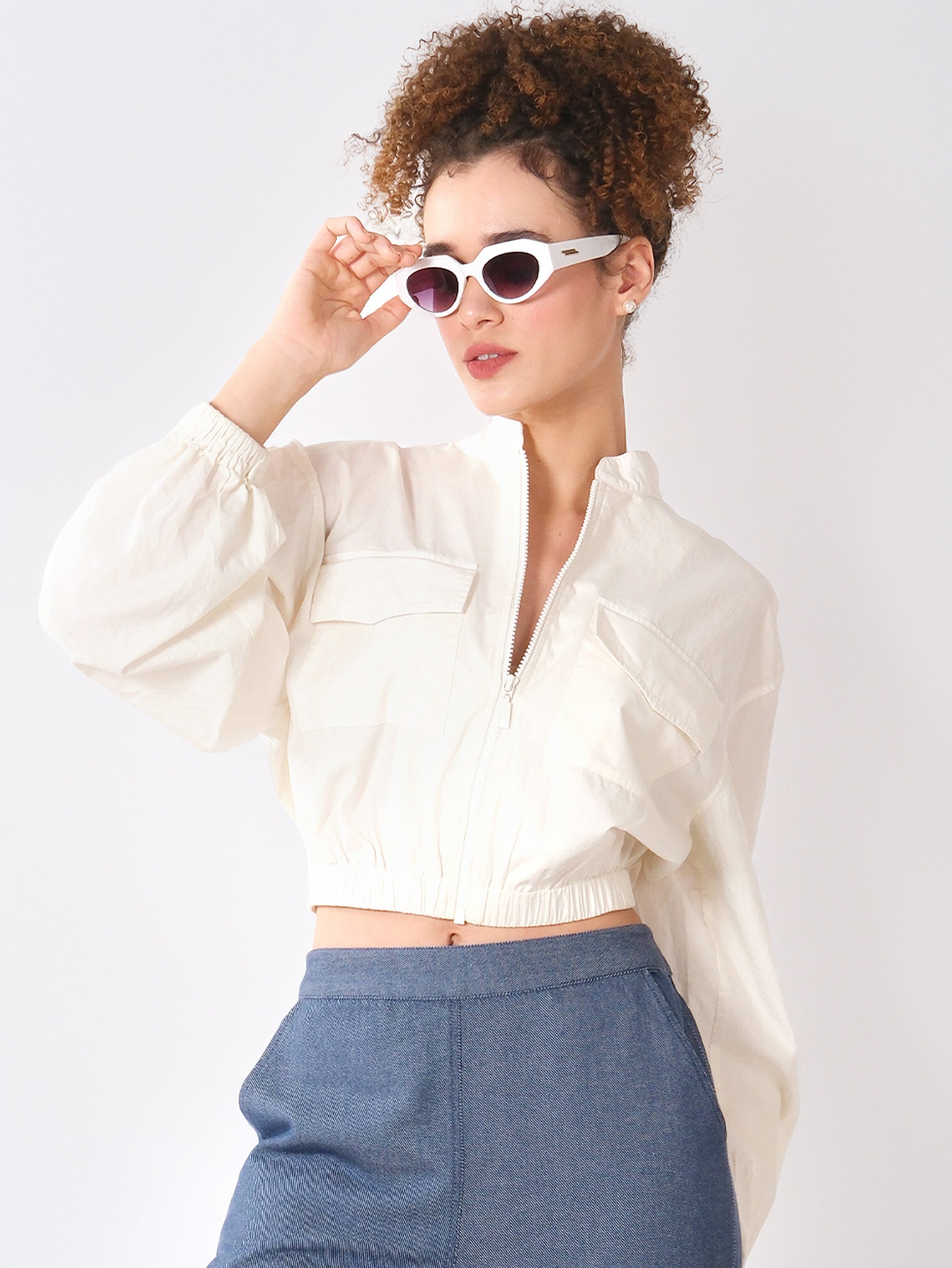 Soft cotton-blend fabric with smooth texture, Stand collar with front zip closure, Full sleeves with elasticated cuffs , Cropped length with gathered elastic hem, Utility-inspired front flap pockets, Relaxed silhouette for easy movement.